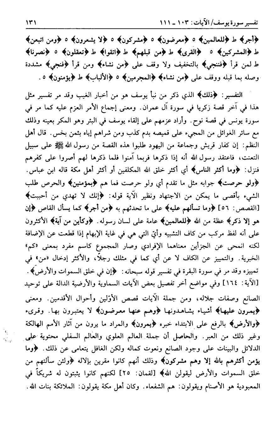 وَلَوْ حَرَصْتَ جوابه مثل ما تقدم أي ولو حرصت فما هم بِمُؤْمِنِينَ والحرص طلب الشيء بأقصى ما يمكن من الاجتهاد ونظير الآية قوله: إِنَّكَ لا تَهْدِي مَنْ أَحْبَبْتَ [القصص: 56] وَما تَسْئَلُهُمْ عَلَيْهِ على ما تحدثهم به مِنْ أَجْرٍ كما يسأل القاص إِنْ هُوَ إِلَّا ذِكْرٌ عظة من الله لِلْعالَمِينَ عامة على لسان رسوله. وَكَأَيِّنْ مِنْ آيَةٍ الأكثرون على أنه لفظ مركب من كاف التشبيه وأيّ التي هي في غاية الإبهام إذا قطعت عن الإضافة لكنه انمحى عن الجزأين معناهما الإفرادي وصار المجموع كاسم مفرد بمعنى «كم» الخبرية. والتمييز عن الكاف لا عن أي كما في مثلك رجلا، والأكثر إدخال «من» في تمييزه وقد مر في سورة البقرة في تفسير قوله سبحانه: إِنَّ فِي خَلْقِ السَّماواتِ وَالْأَرْضِ.