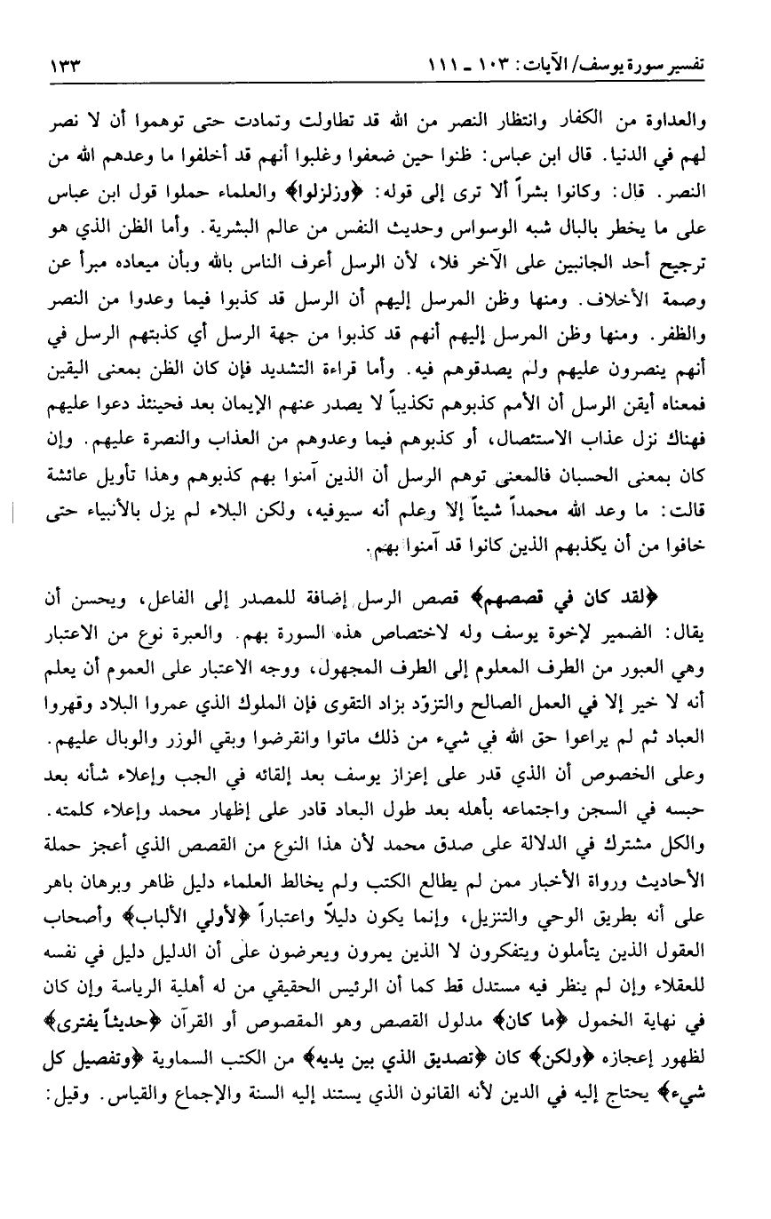 لَقَدْ كانَ فِي قَصَصِهِمْ قصص الرسل إضافة للمصدر إلى الفاعل، ويحسن أن يقال: الضمير لإخوة يوسف وله لاختصاص هذه السورة بهم. والعبرة نوع من الاعتبار وهي العبور من الطرف المعلوم إلى الطرف المجهول، ووجه الاعتبار على العموم أن يعلم أنه لا خير إلا في العمل الصالح والتزوّد بزاد التقوى فإن الملوك الذي عمروا البلاد وقهروا العباد ثم لم يراعوا حق الله في شيء من ذلك ماتوا وانقرضوا وبقي الوزر والوبال عليهم.