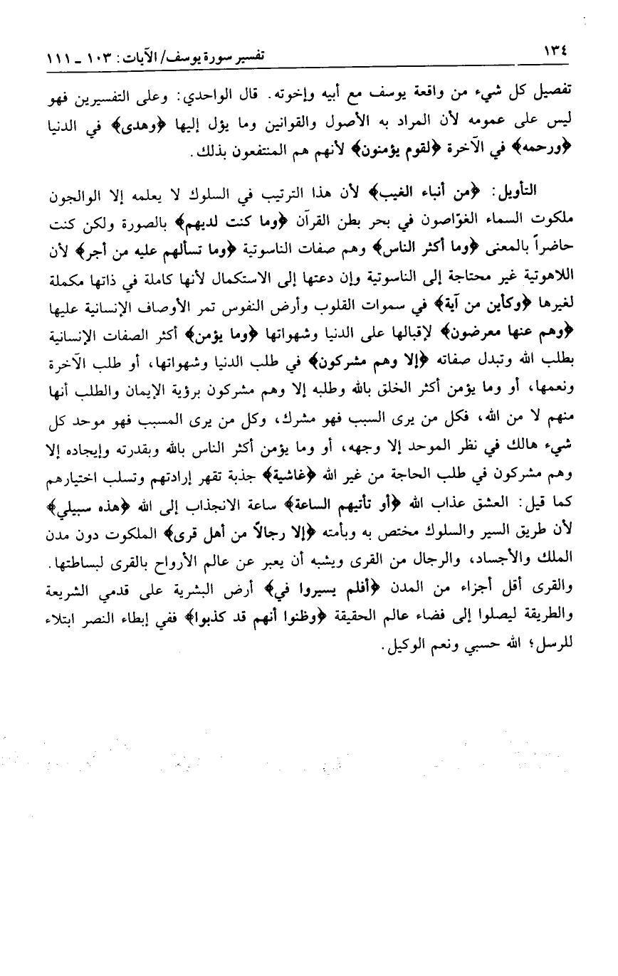 مِنْ أَنْباءِ الْغَيْبِ لأن هذا الترتيب في السلوك لا يعلمه إلا الوالجون ملكوت السماء الغوّاصون في بحر بطن القرآن وَما كُنْتَ لَدَيْهِمْ بالصورة ولكن كنت حاضرا بالمعنى وَما أَكْثَرُ النَّاسِ وهم صفات الناسوتية وَما تَسْئَلُهُمْ عَلَيْهِ مِنْ أَجْرٍ لأن اللاهوتية غير محتاجة إلى الناسوتية وإن دعتها إلى الاستكمال لأنها كاملة في ذاتها مكملة لغيرها وَكَأَيِّنْ مِنْ آيَةٍ في سموات القلوب وأرض النفوس تمر الأوصاف الإنسانية عليها وَهُمْ عَنْها مُعْرِضُونَ لإقبالها على الدنيا وشهواتها وَما يُؤْمِنُ أكثر الصفات الإنسانية بطلب الله وتبدل صفاته إِلَّا وَهُمْ مُشْرِكُونَ في طلب الدنيا وشهواتها، أو طلب الآخرة ونعمها، أو وما يؤمن أكثر الخلق بالله وطلبه إلا وهم مشركون برؤية الإيمان والطلب أنها منهم لا من الله، فكل من يرى السبب فهو مشرك، وكل من يرى المسبب فهو موحد كل شيء هالك في نظر الموحد إلا وجهه، أو وما يؤمن أكثر الناس بالله وبقدرته وإيجاده إلا وهم مشركون في طلب الحاجة من غير الله غاشِيَةٌ جذبة تقهر إرادتهم وتسلب اختيارهم كما قيل: العشق عذاب الله أَوْ تَأْتِيَهُمُ السَّاعَةُ ساعة الانجذاب إلى الله هذِهِ سَبِيلِي لأن طريق السير والسلوك مختص به وبأمته إِلَّا رِجالًا نُوحِي إِلَيْهِمْ مِنْ أَهْلِ الْقُرى الملكوت دون مدن الملك والأجساد، والرجال من القرى ويشبه أن يعبر عن عالم الأرواح بالقرى لبساطتها.
