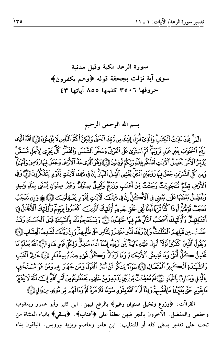 المر تِلْكَ آياتُ الْكِتابِ وَالَّذِي أُنْزِلَ إِلَيْكَ مِنْ رَبِّكَ الْحَقُّ وَلكِنَّ أَكْثَرَ النَّاسِ لا يُؤْمِنُونَ (1) اللَّهُ الَّذِي رَفَعَ السَّماواتِ بِغَيْرِ عَمَدٍ تَرَوْنَها ثُمَّ اسْتَوى عَلَى الْعَرْشِ وَسَخَّرَ الشَّمْسَ وَالْقَمَرَ كُلٌّ يَجْرِي لِأَجَلٍ مُسَمًّى يُدَبِّرُ الْأَمْرَ يُفَصِّلُ الْآياتِ لَعَلَّكُمْ بِلِقاءِ رَبِّكُمْ تُوقِنُونَ (2) وَهُوَ الَّذِي مَدَّ الْأَرْضَ وَجَعَلَ فِيها رَواسِيَ وَأَنْهاراً وَمِنْ كُلِّ الثَّمَراتِ جَعَلَ فِيها زَوْجَيْنِ اثْنَيْنِ يُغْشِي اللَّيْلَ النَّهارَ إِنَّ فِي ذلِكَ لَآياتٍ لِقَوْمٍ يَتَفَكَّرُونَ (3) وَفِي الْأَرْضِ قِطَعٌ مُتَجاوِراتٌ وَجَنَّاتٌ مِنْ أَعْنابٍ وَزَرْعٌ وَنَخِيلٌ صِنْوانٌ وَغَيْرُ صِنْوانٍ يُسْقى بِماءٍ واحِدٍ وَنُفَضِّلُ بَعْضَها عَلى بَعْضٍ فِي الْأُكُلِ إِنَّ فِي ذلِكَ لَآياتٍ لِقَوْمٍ يَعْقِلُونَ (4)