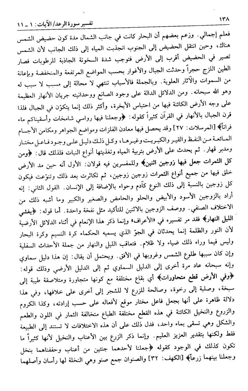 فعلم إجمالي. وزعم بعضهم أن البحار كانت في جانب الشمال مدة كون حضيض الشمس هناك، وحين انتقل الحضيض إلى الجنوب انجذبت المياه إلى ذلك الجانب لأن الشمس تصير في الحضيض أقرب إلى الأرض فتوجب شدة السخونة الجاذبة للرطوبات فصار الطين اللزج حجرا وحدثت الجبال والأغوار بحسب المواضع المرتفعة والمنخفضة وبإعانة من السموات والآثار العلوية. وبالجملة فالأسباب تنتهي لا محالة إلى مسبب لا سبب له وهو الله سبحانه. ومن الدلائل الدالة على وجود الصانع ووحدانيته جريان الأنهار العظيمة على وجه الأرض الكائنة فيها من احتباس الأبخرة، وأكثر ذلك إنما يتكوّن في الجبال فلذا قرن الجبال بالأنهار في القرآن كثيرا كقوله: وَجَعَلْنا فِيها رَواسِيَ شامِخاتٍ وَأَسْقَيْناكُمْ ماءً فُراتاً [المرسلات: 27] وقد يحصل فيها معادن الفلزات ومواضع الجواهر ومكامن الأجسام المائعة من النفط والقير والكبريت وغيرها، وكل ذلك دليل على وجود فاعل مختار ومدبر قهار. ثم يحدث على الأرض بتربية المياه وتغذيتها أنواع النبات فلذلك قال: وَمِنْ كُلِّ الثَّمَراتِ جَعَلَ فِيها زَوْجَيْنِ اثْنَيْنِ وللمفسرين فيه قولان: الأول أنه حين مد الأرض خلق فيها من جميع أنواع الثمرات زوجين زوجين، ثم تكاثرت بعد ذلك وتنوّعت فيكون كل زوجين بالنسبة إلى ذلك النوع كآدم وحواء بالإضافة إلى الإنسان. القول الثاني: إنه أراد بالزوجين الأسود والأبيض والحلو والحامض والصغير والكبير وما أشبه ذلك من الاختلاف الصنفي. ووصف الزوجين بالاثنين للتأكيد مثل نفخة واحدة. أما قوله: يُغْشِي اللَّيْلَ النَّهارَ فقد مر تفسيره في «الأعراف» وإنما ذكر هذا الإنعام في أثناء الدلائل الأرضية لأن النور والظلمة إنما يحدثان في الجوّ الذي يسميه الحكماء كرة النسيم وكرة البحار وليس فيما وراء ذلك ضياء ولا ظلام. فتعاقب الليل والنهار من جملة الأحداث السفلية وإن كان سببها طلوع الشمس وغروبها في الأفق. ويحتمل أن يقال: إن هذا دليل سماوي وإنه سبحانه عاد مرة أخرى إلى الدليل السماوي ثم إلى الدليل الأرضي وذلك قوله: