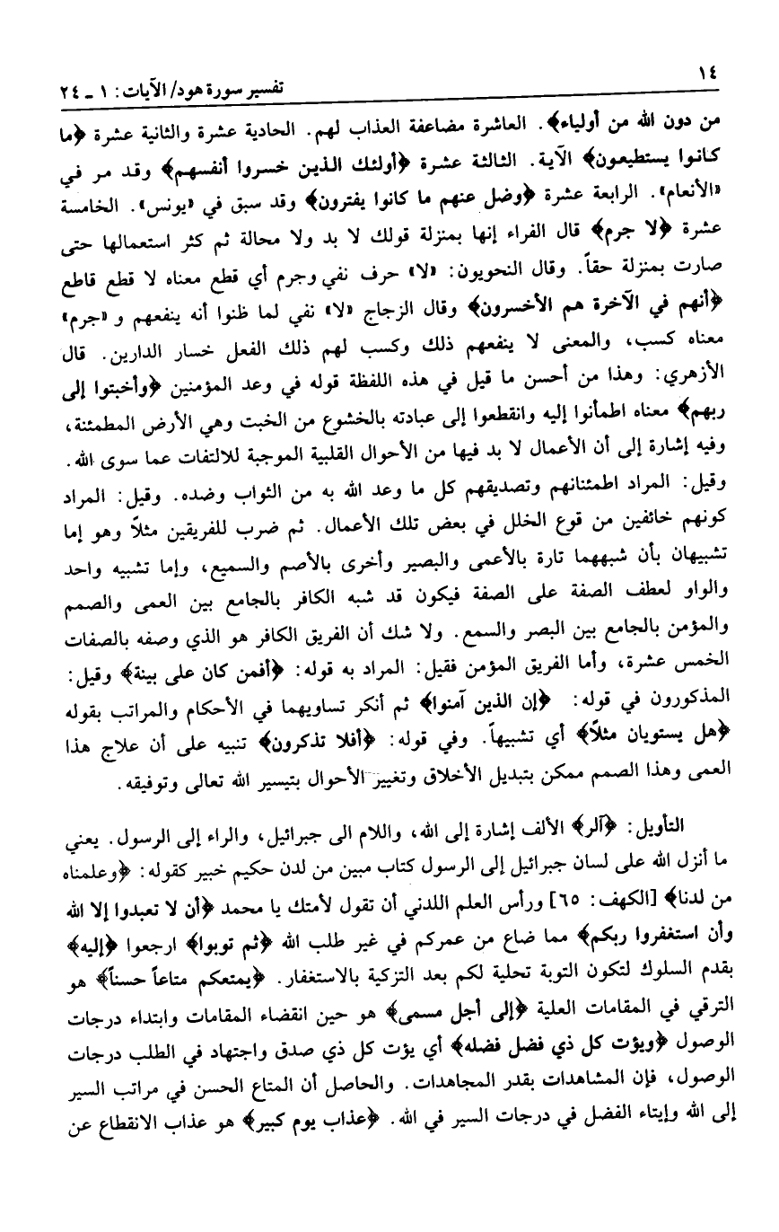 وقد سبق في «يونس» . الخامسة عشرة لا جَرَمَ قال الفراء إنها بمنزلة قولك لا بد ولا محالة ثم كثر استعمالها حتى صارت بمنزلة حقا. وقال النحويون: «لا» حرف نفي وجرم أي قطع معناه لا قطع قاطع أَنَّهُمْ فِي الْآخِرَةِ هُمُ الْأَخْسَرُونَ وقال الزجاج «لا» نفي لما ظنوا أنه ينفعهم و «جرم» معناه كسب، والمعنى لا ينفعهم ذلك وكسب لهم ذلك الفعل خسار الدارين. قال الأزهري: وهذا من أحسن ما قيل في هذه اللفظة قوله في وعد المؤمنين وَأَخْبَتُوا إِلى رَبِّهِمْ معناه اطمأنوا إليه وانقطعوا إلى عبادته بالخشوع من الخبت وهي الأرض المطمئنة، وفيه إشارة إلى أن الأعمال لا بد فيها من الأحوال القلبية الموجبة للالتفات عما سوى الله.