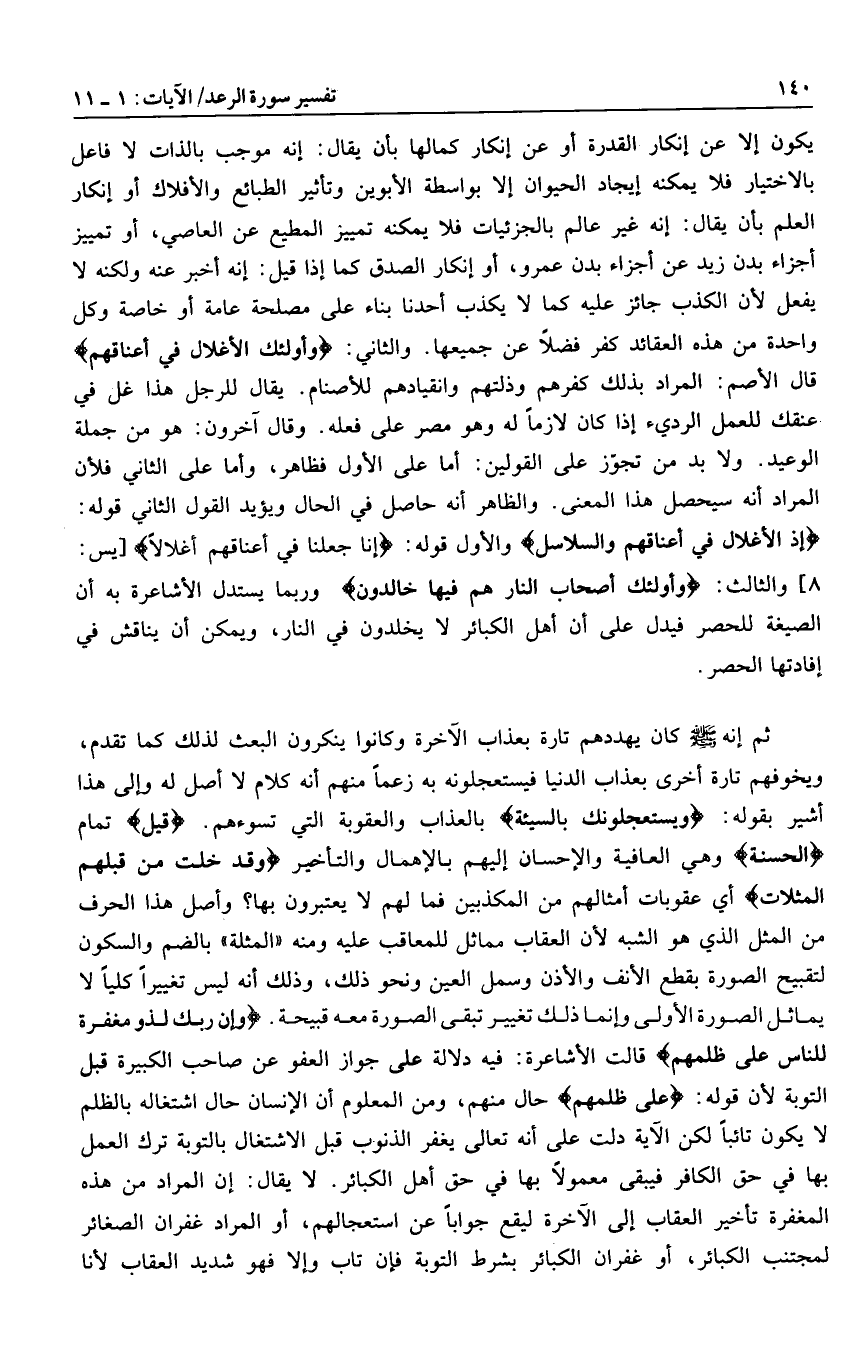 يكون إلا عن إنكار القدرة أو عن إنكار كمالها بأن يقال: إنه موجب بالذات لا فاعل بالاختيار فلا يمكنه إيجاد الحيوان إلا بواسطة الأبوين وتأثير الطبائع والأفلاك أو إنكار العلم بأن يقال: إنه غير عالم بالجزئيات فلا يمكنه تمييز المطيع عن العاصي، أو تمييز أجزاء بدن زيد عن أجزاء بدن عمرو، أو إنكار الصدق كما إذا قيل: إنه أخبر عنه ولكنه لا يفعل لأن الكذب جائز عليه كما لا يكذب أحدنا بناء على مصلحة عامة أو خاصة وكل واحدة من هذه العقائد كفر فضلا عن جميعها. والثاني: وَأُولئِكَ الْأَغْلالُ فِي أَعْناقِهِمْ قال الأصم: المراد بذلك كفرهم وذلتهم وانقيادهم للأصنام. يقال للرجل هذا غل في عنقك للعمل الرديء إذا كان لازما له وهو مصر على فعله. وقال آخرون: هو من جملة الوعيد. ولا بد من تجوّز على القولين: أما على الأول فظاهر، وأما على الثاني فلأن المراد أنه سيحصل هذا المعنى. والظاهر أنه حاصل في الحال ويؤيد القول الثاني قوله: