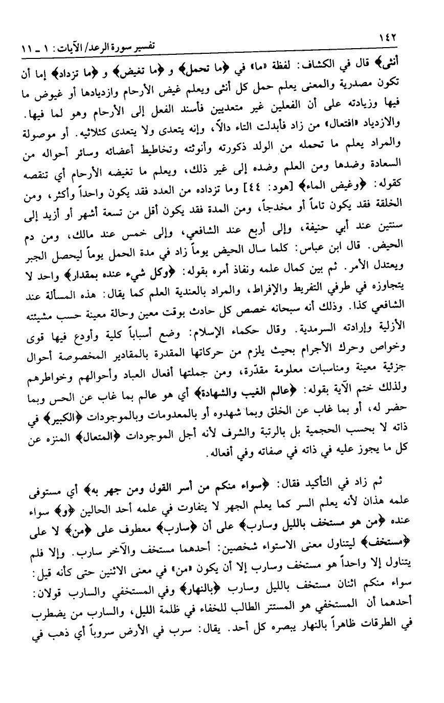 والازدياد «افتعال» من زاد فأبدلت التاء دالا، وإنه يتعدى ولا يتعدى كثلاثيه. أو موصولة والمراد يعلم ما تحمله من الولد ذكورته وأنوثته وتخاطيط أعضائه وسائر أحواله من السعادة وضدها ومن العلم وضده إلى غير ذلك، ويعلم ما تغيضه الأرحام أي تنقصه كقوله: وَغِيضَ الْماءُ [هود: 44] وما تزداده من العدد فقد يكون واحدا وأكثر، ومن الخلقة فقد يكون تاما أو مخدجا، ومن المدة فقد يكون أقل من تسعة أشهر أو أزيد إلى سنتين عند أبي حنيفة، وإلى أربع عند الشافعي، وإلى خمس عند مالك، ومن دم الحيض. قال ابن عباس: كلما سال الحيض يوما زاد في مدة الحمل يوما ليحصل الجبر ويعتدل الأمر. ثم بين كمال علمه ونفاذ أمره بقوله: وَكُلُّ شَيْءٍ عِنْدَهُ بِمِقْدارٍ واحد لا يتجاوزه في طرفي التفريط والإفراط، والمراد بالعندية العلم كما يقال: هذه المسألة عند الشافعي كذا. وذلك أنه سبحانه خصص كل حادث بوقت معين وحالة معينة حسب مشيئته الأزلية وإرادته السرمدية. وقال حكماء الإسلام: وضع أسبابا كلية وأودع فيها قوى وخواص وحرك الأجرام بحيث يلزم من حركاتها المقدرة بالمقادير المخصوصة أحوال جزئية معينة ومناسبات معلومة مقدّرة، ومن جملتها أفعال العباد وأحوالهم وخواطرهم ولذلك ختم الآية بقوله: عالِمُ الْغَيْبِ وَالشَّهادَةِ أي هو عالم بما غاب عن الحس وبما حضر له، أو بما غاب عن الخلق وبما شهدوه أو بالمعدومات وبالموجودات الْكَبِيرُ في ذاته لا بحسب الحجمية بل بالرتبة والشرف لأنه أجل الموجودات الْمُتَعالِ المنزه عن كل ما يجوز عليه في ذاته في صفاته وفي أفعاله.