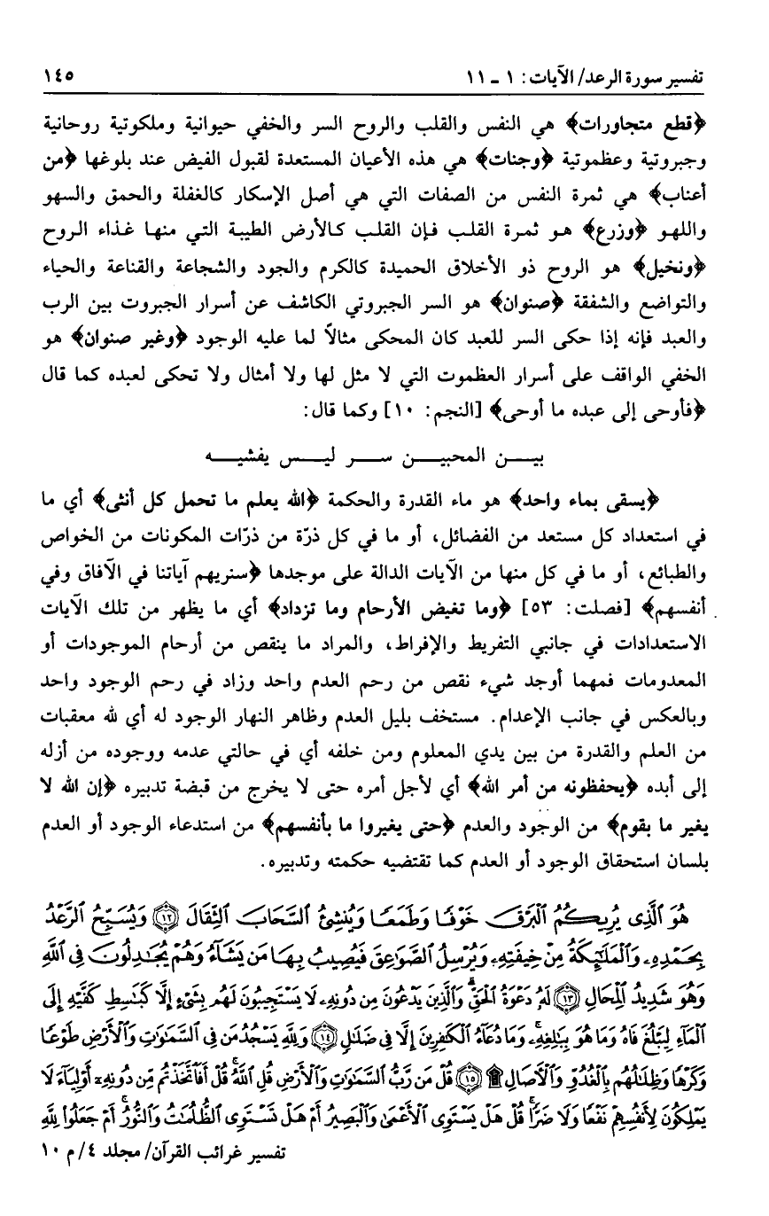 بين المحبين سر ليس يفشيه يُسْقى بِماءٍ واحِدٍ هو ماء القدرة والحكمة اللَّهُ يَعْلَمُ ما تَحْمِلُ كُلُّ أُنْثى أي ما في استعداد كل مستعد من الفضائل، أو ما في كل ذرّة من ذرّات المكونات من الخواص والطبائع، أو ما في كل منها من الآيات الدالة على موجدها سَنُرِيهِمْ آياتِنا فِي الْآفاقِ وَفِي أَنْفُسِهِمْ [فصلت: 53] وَما تَغِيضُ الْأَرْحامُ وَما تَزْدادُ أي ما يظهر من تلك الآيات الاستعدادات في جانبي التفريط والإفراط، والمراد ما ينقص من أرحام الموجودات أو المعدومات فمهما أوجد شيء نقص من رحم العدم واحد وزاد في رحم الوجود واحد وبالعكس في جانب الإعدام. مستخف بليل العدم وظاهر النهار الوجود له أي لله معقبات من العلم والقدرة من بين يدي المعلوم ومن خلفه أي في حالتي عدمه ووجوده من أزله إلى أبده يَحْفَظُونَهُ مِنْ أَمْرِ اللَّهِ أي لأجل أمره حتى لا يخرج من قبضة تدبيره إِنَّ اللَّهَ لا يُغَيِّرُ ما بِقَوْمٍ من الوجود والعدم حَتَّى يُغَيِّرُوا ما بِأَنْفُسِهِمْ من استدعاء الوجود أو العدم بلسان استحقاق الوجود أو العدم كما تقتضيه حكمته وتدبيره.