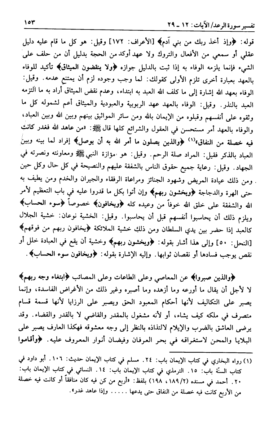 قوله: وَإِذْ أَخَذَ رَبُّكَ مِنْ بَنِي آدَمَ [الأعراف: 172] وقيل: هو كل ما قام عليه دليل عقلي أو سمعي من الأفعال والتروك ولا عهد أوكد من الحجة بدليل أن من حلف على الشيء فإنما يلزمه الوفاء به إذا ثبت بالدليل جوازه وَلا يَنْقُضُونَ الْمِيثاقَ تأكيد للوفاء بالعهد بعبارة أخرى تلزم الأولى كقولك: لما وجب وجوده لزم أن يمتنع عدمه. وقيل: