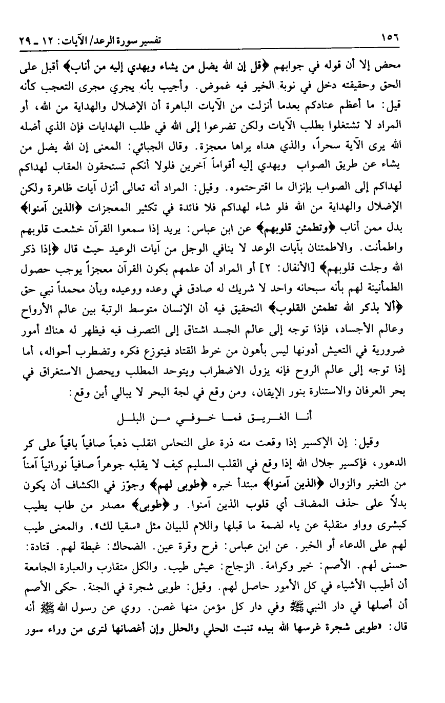 أنا الغريق فما خوفي من البلل وقيل: إن الإكسير إذا وقعت منه ذرة على النحاس انقلب ذهبا صافيا باقيا على كر الدهور، فإكسير جلال الله إذا وقع في القلب السليم كيف لا يقلبه جوهرا صافيا نورانيا آمنا من التغير والزوال الَّذِينَ آمَنُوا مبتدأ خبره طُوبى لَهُمْ وجوّز في الكشاف أن يكون بدلا على حذف المضاف أي قلوب الذين آمنوا. وطُوبى مصدر من طاب يطيب كبشرى وواو منقلبة عن ياء لضمة ما قبلها واللام للبيان مثل «سقيا لك» . والمعنى طيب لهم على الدعاء أو الخبر. عن ابن عباس: فرح وقرة عين. الضحاك: غبطة لهم. قتادة: