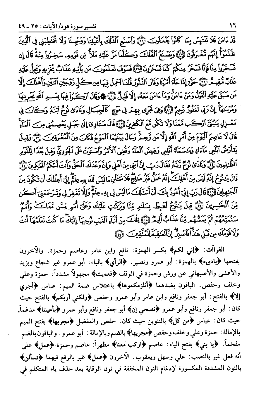 إِنِّي لَكُمْ بكسر الهمزة: نافع وابن عامر وعاصم وحمزة. والآخرون بفتحها بادِيَ بالهمزة: أبو عمرو ونصير. الرَّأْيِ بالياء: أبو عمرو غير شجاع ويزيد والأعشى والأصبهاني عن ورش وحمزة في الوقف فَعُمِّيَتْ مجهولا مشددا: حمزة وعلي وخلف وحفص. الباقون بضدهما أَنُلْزِمُكُمُوها باختلاس ضمة الميم: عباس أَجرِيَ إِلَّا بالفتح: أبو جعفر ونافع وابن عامر وأبو عمرو وحفص وَلكِنِّي أَراكُمْ بالفتح حيث كان: أبو جعفر ونافع وأبو عمرو نُصْحِي إِنْ أبو جعفر ونافع وأبو عمرو بِأَعْيُنِنا مدغما.