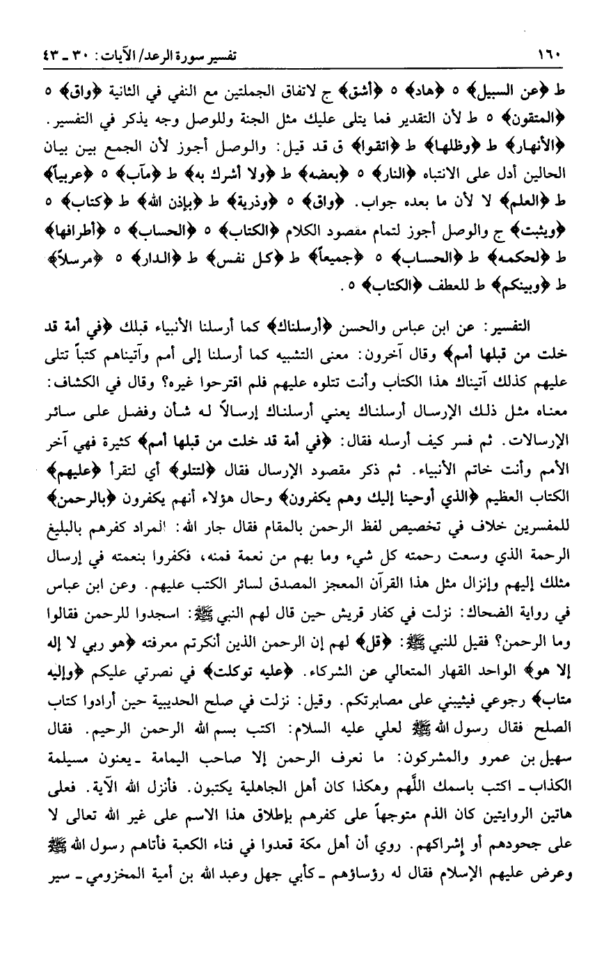 الْأَنْهارُ ط وَظِلُّها ط اتَّقَوْا ق قد قيل: والوصل أجوز لأن الجمع بين بيان الحالين أدل على الانتباه النَّارُ هـ بَعْضَهُ ط وَلا أُشْرِكَ بِهِ ط مَآبِ هـ عَرَبِيًّا ط الْعِلْمِ لا لأن ما بعده جواب. واقٍ هـ وَذُرِّيَّةً ط بِإِذْنِ اللَّهِ ط كِتابٌ هـ وَيُثْبِتُ ج والوصل أجوز لتمام مقصود الكلام الْكِتابِ هـ الْحِسابُ هـ أَطْرافِها ط لِحُكْمِهِ ط الْحِسابِ هـ جَمِيعاً ط كُلُّ نَفْسٍ ط الدَّارِ هـ مُرْسَلًا ط وَبَيْنَكُمْ ط للعطف الْكِتابِ هـ.