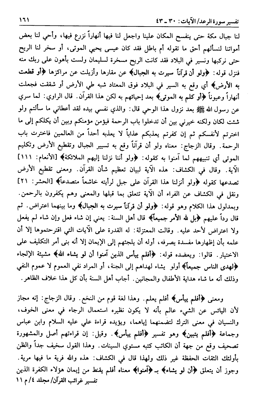 وبمدلول هذا الكلام وهو قوله: وَلَوْ أَنَّ قُرْآناً سُيِّرَتْ بِهِ الْجِبالُ وما بينهما اعتراض. ثم قال ردا عليهم بَلْ لِلَّهِ الْأَمْرُ جَمِيعاً قال أهل السنة: يعني إن شاء فعل وإن شاء لم يفعل ولا اعتراض لأحد عليه. وقالت المعتزلة: له القدرة على الآيات التي اقترحتموها إلا أن علمه بأن إظهارها مفسدة يصرفه، أوله أن يلجئهم إلى الإيمان إلا أنه بنى أمر التكليف على الاختيار. قالوا: ويعضده قوله: أَفَلَمْ يَيْأَسِ الَّذِينَ آمَنُوا أَنْ لَوْ يَشاءُ اللَّهُ مشيئة الإلجاء لَهَدَى النَّاسَ جَمِيعاً أولو يشاء لهداهم إلى الجنة، أو المراد نفي العموم لا عموم النفي وذلك أنه ما شاء هداية الأطفال والمجانين. أجاب أهل السنة بأن كل هذا خلاف الظاهر.