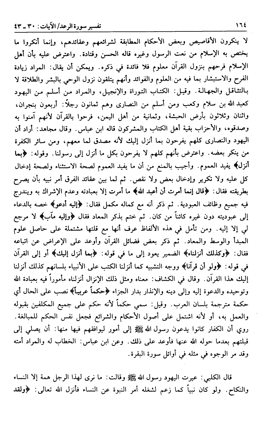 لا ينكرون الأقاصيص وبعض الأحكام المطابقة لشرائعهم وعقائدهم، وإنما أنكروا ما يختص به الإسلام من نعت الرسول وغيره قاله الحسن وقتادة. واعترض عليه بأن أهل الإسلام فرحهم بنزول القرآن معلوم فلا فائدة في ذكره. ويمكن أن يقال: المراد زيادة الفرح والاستبشار بما فيه من العلوم والفوائد وأنهم يتلقون نزول الوحي بالبشر والطلاقة لا بالتثاقل والجهالة. وقيل: الكتاب التوراة والإنجيل، والمراد من أسلم من اليهود كعبد الله بن سلام وكعب ومن أسلم من النصارى وهم ثمانون رجلا: أربعون بنجران، واثنان وثلاثون بأرض الحبشة، وثمانية من أهل اليمن، فرحوا بالقرآن لأنهم آمنوا به وصدقوه، والأحزاب بقية أهل الكتاب والمشركون قاله ابن عباس. وقال مجاهد: أراد أن اليهود والنصارى كلهم يفرحون بما أنزل إليك لأنه مصدق لما معهم، ومن سائر الكفرة من ينكر بعضه. واعترض بأنهم كلهم لا يفرحون بكل ما أنزل إلى رسولنا. وقوله: بِما أُنْزِلَ يفيد العموم. وأجيب بالمنع من أن ما يفيد العموم لصحة الاستثناء ولصحة إدخال كل عليه ولا تكرير وإدخال بعض ولا نقص. ثم لما بين عقائد الفرق أمر نبيه بأن يصرح بطريقته فقال: قُلْ إِنَّما أُمِرْتُ أَنْ أَعْبُدَ اللَّهَ ما أمرت إلا بعبادته وعدم الإشراك به ويندرج فيه جميع وظائف العبودية. ثم ذكر أنه مع كماله مكمل فقال: إِلَيْهِ أَدْعُوا خصه بالدعاء إلى عبوديته دون غيره كائنا من كان. ثم ختم بذكر المعاد فقال وَإِلَيْهِ مَآبِ لا مرجع لي إلا إليه. ومن تأمل في هذه الألفاظ عرف أنها مع قلتها مشتملة على حاصل علوم المبدأ والوسط والمعاد. ثم ذكر بعض فضائل القرآن وأوعد على الإعراض عن اتباعه فقال: وَكَذلِكَ أَنْزَلْناهُ الضمير يعود إلى ما في قوله: بِما أُنْزِلَ إِلَيْكَ أو إلى القرآن في قوله: وَلَوْ أَنَّ قُرْآناً ووجه التشبيه كما أنزلنا الكتب على الأنبياء بلسانهم كذلك أنزلنا إليك هذا القرآن. وقال في الكشاف: معناه ومثل ذلك الإنزال أنزلناه مأمورا فيه بعبادة الله وتوحيده والدعوة إليه وإلى دينه والإنذار بدار الجزاء حُكْماً عَرَبِيًّا نصب على الحال أي حكمة مترجمة بلسان العرب. وقيل: سمي حكما لأنه حكم على جميع المكلفين بقبوله والعمل به، أو لأنه اشتمل على أصول الأحكام والشرائع فجعل نفس الحكم للمبالغة.