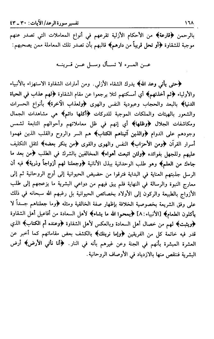 بأنواع الحسرات والشعور بالهيئات والملكات الموجبة للدركات أُكُلُها دائِمٌ هي مشاهدات الجمال ومكاشفات الجلال وَظِلُّها أي إنهم في ظل معاملاتهم وأحوالهم التابعة لشمس وجودهم على الدوام وَالَّذِينَ آتَيْناهُمُ الْكِتابَ هم السر والروح والقلب الذين فهموا أسرار القرآن وَمِنَ الْأَحْزابِ النفس والهوى والقوى مَنْ يُنْكِرُ بَعْضَهُ لثقل التكليف عليهم وللجهل بفوائده وَلَئِنِ اتَّبَعْتَ أَهْواءَهُمْ المخالفين بالشرك في الطلب من بَعْدَ ما جاءَكَ مِنَ الْعِلْمِ وهو طلب الوحدانية ببذل الأنانية وَجَعَلْنا لَهُمْ أَزْواجاً وَذُرِّيَّةً فيه أن الرسل جذبتهم العناية في البداية فترقوا من حضيض الحيوانية إلى أوج الروحانية ثم إلى معارج النبوة والرسالة في النهاية فلم يبق فيهم من دواعي البشرية ما يزعجهم إلى طلب الأزواج بالطبيعة والركون إلى الأولاد بخصائص الحيوانية بل رغبهم الله سبحانه في ذلك على وفق الشريعة بخصوصية الخلافة بإظهار صفة الخالقية ومثله وَما جَعَلْناهُمْ جَسَداً لا يَأْكُلُونَ الطَّعامَ [الأنبياء: 8] يَمْحُوا اللَّهُ ما يَشاءُ لأهل السعادة من أفاعيل أهل الشقاوة وَيُثْبِتُ لهم من خصال أهل السعادة وبالعكس لأهل الشقاوة وَعِنْدَهُ أُمُّ الْكِتابِ الذي قدر فيه خاتمة كل من الفريقين وَإِمَّا نُرِيَنَّكَ بالكشف بعض مقاماتهم كما أخبر عن العشرة المبشرة بأنهم في الجنة وعن غيرهم بأنه في النار. أَنَّا نَأْتِي الْأَرْضَ أرض البشرية فننقص منها بالازدياد في الأوصاف الروحانية.