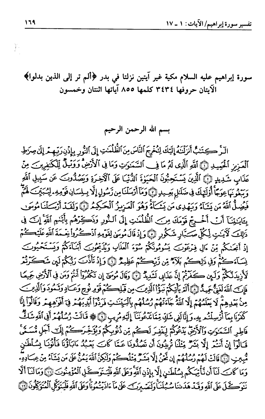 الر كِتابٌ أَنْزَلْناهُ إِلَيْكَ لِتُخْرِجَ النَّاسَ مِنَ الظُّلُماتِ إِلَى النُّورِ بِإِذْنِ رَبِّهِمْ إِلى صِراطِ الْعَزِيزِ الْحَمِيدِ (1) اللَّهِ الَّذِي لَهُ ما فِي السَّماواتِ وَما فِي الْأَرْضِ وَوَيْلٌ لِلْكافِرِينَ مِنْ عَذابٍ شَدِيدٍ (2) الَّذِينَ يَسْتَحِبُّونَ الْحَياةَ الدُّنْيا عَلَى الْآخِرَةِ وَيَصُدُّونَ عَنْ سَبِيلِ اللَّهِ وَيَبْغُونَها عِوَجاً أُولئِكَ فِي ضَلالٍ بَعِيدٍ (3) وَما أَرْسَلْنا مِنْ رَسُولٍ إِلاَّ بِلِسانِ قَوْمِهِ لِيُبَيِّنَ لَهُمْ فَيُضِلُّ اللَّهُ مَنْ يَشاءُ وَيَهْدِي مَنْ يَشاءُ وَهُوَ الْعَزِيزُ الْحَكِيمُ (4)