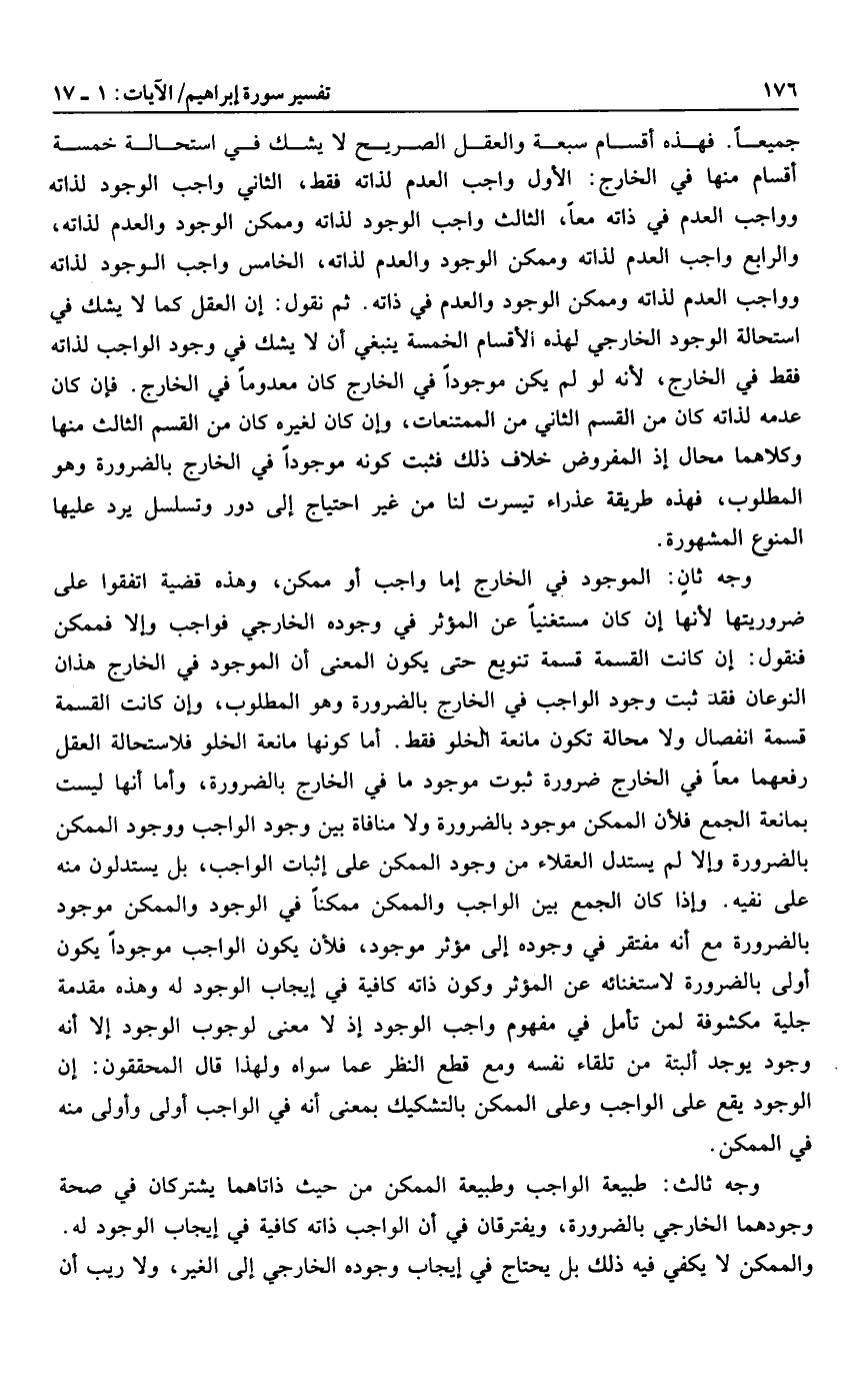 جميعا. فهذه أقسام سبعة والعقل الصريح لا يشك في استحالة خمسة أقسام منها في الخارج: الأول واجب العدم لذاته فقط، الثاني واجب الوجود لذاته وواجب العدم في ذاته معا، الثالث واجب الوجود لذاته وممكن الوجود والعدم لذاته، والرابع واجب العدم لذاته وممكن الوجود والعدم لذاته، الخامس واجب الوجود لذاته وواجب العدم لذاته وممكن الوجود والعدم في ذاته. ثم نقول: إن العقل كما لا يشك في استحالة الوجود الخارجي لهذه الأقسام الخمسة ينبغي أن لا يشك في وجود الواجب لذاته فقط في الخارج، لأنه لو لم يكن موجودا في الخارج كان معدوما في الخارج. فإن كان عدمه لذاته كان من القسم الثاني من الممتنعات، وإن كان لغيره كان من القسم الثالث منها وكلاهما محال إذ المفروض خلاف ذلك فثبت كونه موجودا في الخارج بالضرورة وهو المطلوب، فهذه طريقة عذراء تيسرت لنا من غير احتياج إلى دور وتسلسل يرد عليها المنوع المشهورة.