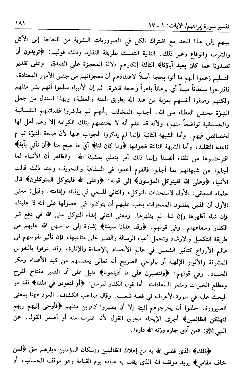 بينهم إلى هذا الحد مع اشتراك الكل في الضروريات البشرية من الحاجة إلى الأكل والشرب والوقاع وغير ذلك. الثانية التمسك بطريقة التقليد وذلك قولهم: تُرِيدُونَ أَنْ تَصُدُّونا عَمَّا كانَ يَعْبُدُ آباؤُنا الثالثة إنكارهم دلالة المعجزة على الصدق. وعلى تقدير التسليم زعموا أنهم ما أتوا بحجة أصلا لاعتقادهم أن معجزاتهم من جنس الأمور المعتادة، فاقترحوا سلطانا مبينا أي برهانا باهرا وحجة قاهرة. ثم إن الأنبياء سلموا أنهم بشر مثلهم ولكنهم وصفوا أنفسهم بمزية من عند الله بطريق المنة والعطية، وبهذا استدل من جعل النبوّة محض العطاء من الله. أجاب المخالف بأنهم لم يذكروا فضائلهم النفسانية والجسمانية تواضعا منهم، ولأنه قد علم أنه لا يختصهم بتلك الكرامة إلا وهم أهل لها لخصائص فيهم. وأما الشبهة الثانية فإنما لم يذكروا الجواب عنها لأن صحة النبوّة تهدم قاعدة التقليد، وأما الشبهة الثالثة فجوابها وَما كانَ لَنا أي ما صح منا أن نأتي بآية اقترحتموها من تلقاء أنفسنا وإنما ذلك أمر يتعلق بمشيئة الله. والظاهر أن الأنبياء لما أجابوا عن شبهاتهم بما أجابوا فالقوم أخذوا في السفاهة والتخويف وعند ذلك قالت الأنبياء وَعَلَى اللَّهِ فَلْيَتَوَكَّلِ الْمُؤْمِنُونَ إلى قوله: وَعَلَى اللَّهِ فَلْيَتَوَكَّلِ الْمُتَوَكِّلُونَ قال علماء المعاني: الأول لاستحداث التوكل، والثاني للسعي في إبقائه وإدامته. وقيل: معنى الأول أن الذين يطلبون المعجزات يجب عليهم أن يتوكلوا في حصولها على الله لا علينا، فإن شاء أظهرها وإن شاء لم يظهرها. ومعنى الثاني إبداء التوكل على الله في دفع شر الكفار وسفاهتهم. وفي قولهم: وَقَدْ هَدانا سُبُلَنا إشارة إلى ما سهل الله عليهم من طريقة التكميل والإرشاد وتحمل أعباء الرسالة والصبر على متاعبها، فإن تأثير نفوسهم في عالم الأرواح كتأثير الشمس في عالم الأجسام بالإضاءة والإنارة، وقد عرفوا بالنفوس المشرقة والأنوار الإلهية أو بالوحي الصريح أنه تعالى يعصمهم من كيد الأعداء ومكر الحساد. وفي قولهم: وَلَنَصْبِرَنَّ عَلى ما آذَيْتُمُونا دليل على أن الصبر مفتاح الفرج ومطلع الخيرات ومثمر السعادات. أما قول الكفار للرسل: أَوْ لَتَعُودُنَّ فِي مِلَّتِنا فقد مر البحث عليه في سورة الأعراف في قصة شعيب. وقال صاحب الكشاف: العود هاهنا بمعنى الصيرورة، حلفوا أن يخرجوهم البتة إلا أن يصيروا كافرين مثلهم فَأَوْحى إِلَيْهِمْ رَبُّهُمْ لَنُهْلِكَنَّ الظَّالِمِينَ أجرى الإيحاء مجرى القول لأنه ضرب منه أو أضمر القول.