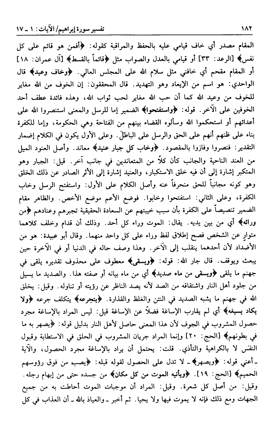 المقام مصدر أي خاف قيامي عليه بالحفظ والمراقبة كقوله: أَفَمَنْ هُوَ قائِمٌ عَلى كُلِّ نَفْسٍ [الرعد: 33] أو قيامي بالعدل والصواب مثل قائِماً بِالْقِسْطِ [آل عمران: 18] أو المقام مقحم أي خافني مثل سلام الله على المجلس العالي. وَخافَ وَعِيدِ قال الواحدي: هو اسم من الإيعاد وهو التهديد. قال المحققون: إن الخوف من الله مغاير للخوف من وعيد الله كما أن حب الله مغاير لحب ثواب الله، وهذه فائدة عطف أحد الخوفين على الآخر. قوله: وَاسْتَفْتَحُوا الضمير إما للرسل والمعنى استنصروا الله على أعدائهم أو استحكموا الله وسألوه القضاء بينهم من الفتاحة وهي الحكومة، وإما للكفرة بناء على ظنهم أنهم على الحق والرسل على الباطل. وعلى الأول يكون في الكلام إضمار التقدير: فنصروا وفازوا بالمقصود. وَخابَ كُلُّ جَبَّارٍ عَنِيدٍ معاند. وأصل العنود الميل من العند الناحية والجانب كأن كلا من المتعاندين في جانب آخر. قيل: الجبار وهو المتكبر إشارة إلى أن فيه خلق الاستكبار، والعنيد إشارة إلى الأثر الصادر عن ذلك الخلق وهو كونه مجانبا للحق منحرفا عنه وأصل الكلام على الأول: واستفتح الرسل وخاب الكفرة، وعلى الثاني: استفتحوا وخابوا. فوضع الأعم موضع الأخص. والظاهر مقام الضمير تنصيصا على الكفرة بأن سبب خيبتهم عن السعادة الحقيقية تجبرهم وعنادهم مِنْ وَرائِهِ أي من بين يديه. يقال: الموت وراء كل أحد. وذلك أن قدام وخلف كلاهما متوار عن الشخص فصح إطلاق لفظ وراء على كل واحد منهما. وقال أبو عبيدة: هو من الأضداد لأن أحدهما ينقلب إلى الآخر. وهذا وصف حاله في الدنيا أو في الآخرة حين يبعث ويوقف. قال جار الله: قوله: وَيُسْقى معطوف على محذوف تقديره يلقى في جهنم ما يلقى وَيُسْقى مِنْ ماءٍ صَدِيدٍ أي من ماء بيانه أو صفته هذا. والصديد ما يسيل من جلود أهل النار واشتقاقه من الصد لأنه يصد الناظر عن رؤيته أو تناوله. وقيل: يخلق الله في جهنم ما يشبه الصديد في النتن والغلظ والقذارة. يَتَجَرَّعُهُ يتكلف جرعه وَلا يَكادُ يُسِيغُهُ أي لم يقارب الإساغة فضلا عن الإساغة قيل: ليس المراد بالإساغة مجرد حصول المشروب في الجوف لأن هذا المعنى حاصل لأهل النار بدليل قوله: يُصْهَرُ بِهِ ما فِي بُطُونِهِمْ [الحج: 20] وإنما المراد جريان المشروب في الحلق في الاستطابة وقبول النفس لا بالكراهية والتأذي. قلت: يحتمل أن يراد بالإساغة مجرد الحصول، والآية- أعني قوله: ويصهر- لا تدل على الحصول لقوله قبله: يُصَبُّ مِنْ فَوْقِ رُؤُسِهِمُ الْحَمِيمُ [الحج: 19] . وَيَأْتِيهِ الْمَوْتُ مِنْ كُلِّ مَكانٍ من جسده حتى من إبهام رجله.