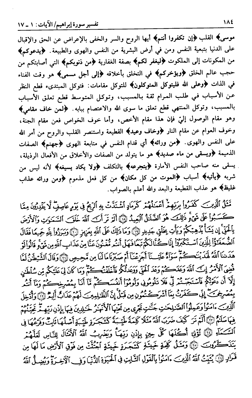 القلب إِنْ تَكْفُرُوا أَنْتُمْ أيها الروح والسر والخفي بالإعراض عن الحق والإقبال على الدنيا بتبعية النفس ومن في أرض البشرية من النفس والهوى والطبيعة. يَدْعُوكُمْ من المكونات إلى الملكوت لِيَغْفِرَ لَكُمْ بصفة الغفارية مِنْ ذُنُوبِكُمْ التي أصابتكم من حجب عالم الخلق وَيُؤَخِّرَكُمْ في التخلق بأخلاقه إِلى أَجَلٍ مُسَمًّى هو وقت الفناء في الذات وَعَلَى اللَّهِ فَلْيَتَوَكَّلِ الْمُتَوَكِّلُونَ للتوكل مقامات: فتوكل المبتدئ قطع النظر عن الأسباب في طلب المرام ثقة بالمسبب، وتوكل المتوسط قطع تعلق الأسباب بالمسبب، وتوكل المنتهي قطع تعلق ما سوى الله والاعتصام ببابه. لِمَنْ خافَ مَقامِي وهو مقام الوصول إليّ فإن هذا مقام الأخص، وأما خوف الخواص فعن مقام الجنة، وخوف العوام عن مقام النار وَخافَ وَعِيدِ القطعية واستنصر القلب والروح من أمر الله على النفس والهوى. مِنْ وَرائِهِ أي قدام النفس في متابعة الهوى جَهَنَّمُ الصفات الذميمة وَيُسْقى مِنْ ماءٍ صَدِيدٍ هو ما يتولد من الصفات والأخلاق من الأفعال الرذيلة، يسقى منه صاحب النفس الأمارة يَتَجَرَّعُهُ بالتكلف وَلا يَكادُ يُسِيغُهُ لأنه ليس من شربه يَأْتِيهِ أسباب الْمَوْتُ مِنْ كُلِّ مَكانٍ من كل فعل مذموم وَمِنْ وَرائِهِ عَذابٌ غَلِيظٌ هو عذاب القطيعة والبعد والله أعلم بالصواب.