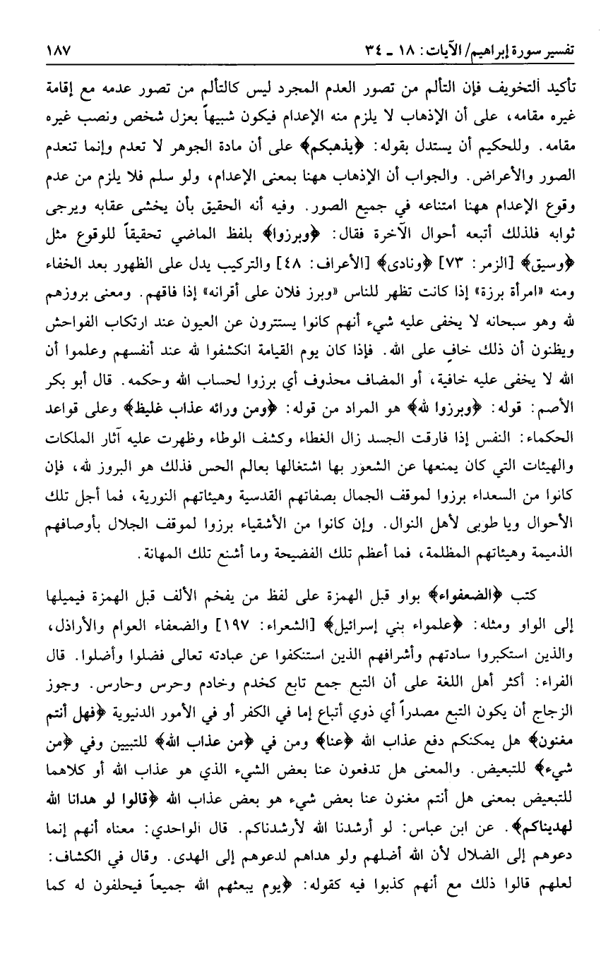 تأكيد التخويف فإن التألم من تصور العدم المجرد ليس كالتألم من تصور عدمه مع إقامة غيره مقامه، على أن الإذهاب لا يلزم منه الإعدام فيكون شبيها بعزل شخص ونصب غيره مقامه. وللحكيم أن يستدل بقوله: يُذْهِبْكُمْ على أن مادة الجوهر لا تعدم وإنما تنعدم الصور والأعراض. والجواب أن الإذهاب هاهنا بمعنى الإعدام، ولو سلم فلا يلزم من عدم وقوع الإعدام هاهنا امتناعه في جميع الصور. وفيه أنه الحقيق بأن يخشى عقابه ويرجى ثوابه فلذلك أتبعه أحوال الآخرة فقال: وَبَرَزُوا بلفظ الماضي تحقيقا للوقوع مثل وَسِيقَ [الزمر: 73] وَنادى [الأعراف: 48] والتركيب يدل على الظهور بعد الخفاء ومنه «امرأة برزة» إذا كانت تظهر للناس «وبرز فلان على أقرانه» إذا فاقهم. ومعنى برزوهم لله وهو سبحانه لا يخفى عليه شيء أنهم كانوا يستترون عن العيون عند ارتكاب الفواحش ويظنون أن ذلك خاف على الله. فإذا كان يوم القيامة انكشفوا لله عند أنفسهم وعلموا أن الله لا يخفى عليه خافية، أو المضاف محذوف أي برزوا لحساب الله وحكمه. قال أبو بكر الأصم: قوله: وَبَرَزُوا لِلَّهِ هو المراد من قوله: وَمِنْ وَرائِهِ عَذابٌ غَلِيظٌ وعلى قواعد الحكماء: النفس إذا فارقت الجسد زال الغطاء وكشف الوطاء وظهرت عليه آثار الملكات والهيئات التي كان يمنعها عن الشعور بها اشتغالها بعالم الحس فذلك هو البروز لله، فإن كانوا من السعداء برزوا لموقف الجمال بصفاتهم القدسية وهيئاتهم النورية، فما أجل تلك الأحوال ويا طوبى لأهل النوال. وإن كانوا من الأشقياء برزوا لموقف الجلال بأوصافهم الذميمة وهيئاتهم المظلمة، فما أعظم تلك الفضيحة وما أشنع تلك المهانة.