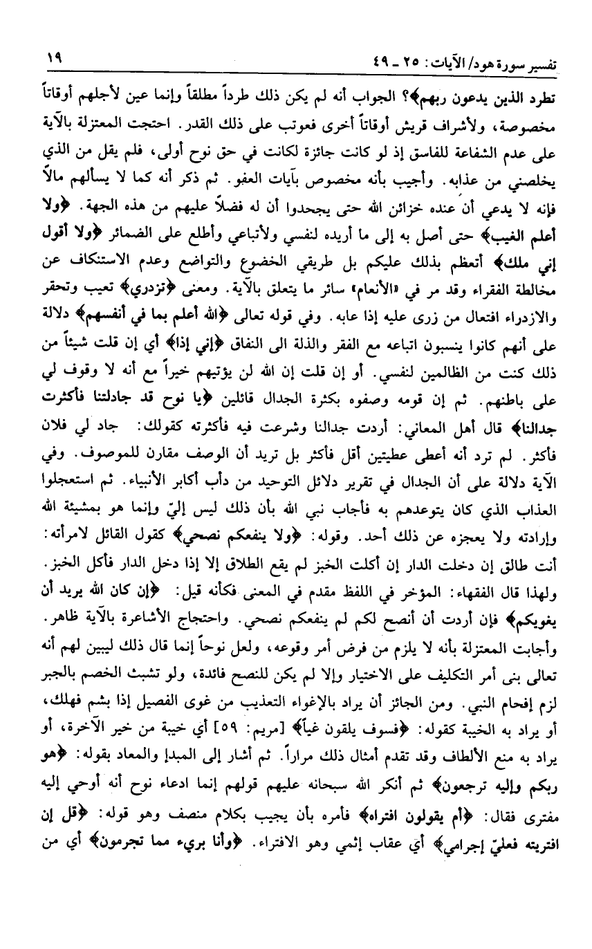 تَطْرُدِ الَّذِينَ يَدْعُونَ رَبَّهُمْ؟ الجواب أنه لم يكن ذلك طردا مطلقا وإنما عين لأجلهم أوقاتا مخصوصة، ولأشراف قريش أوقاتا أخرى فعوتب على ذلك القدر. احتجت المعتزلة بالآية على عدم الشفاعة للفاسق إذ لو كانت جائزة لكانت في حق نوح أولى، فلم يقل من الذي يخلصني من عذابه. وأجيب بأنه مخصوص بآيات العفو. ثم ذكر أنه كما لا يسألهم مالا فإنه لا يدعي أن عنده خزائن الله حتى يجحدوا أن له فضلا عليهم من هذه الجهة. وَلا أَعْلَمُ الْغَيْبَ حتى أصل به إلى ما أريده لنفسي ولأتباعي وأطلع على الضمائر وَلا أَقُولُ إِنِّي مَلَكٌ أتعظم بذلك عليكم بل طريقي الخضوع والتواضع وعدم الاستنكاف عن مخالطة الفقراء وقد مر في «الأنعام» سائر ما يتعلق بالآية. ومعنى تَزْدَرِي تعيب وتحقر والازدراء افتعال من زرى عليه إذا عابه. وفي قوله تعالى اللَّهُ أَعْلَمُ بِما فِي أَنْفُسِهِمْ دلالة على أنهم كانوا ينسبون اتباعه مع الفقر والذلة الى النفاق إِنِّي إِذاً أي إن قلت شيئا من ذلك كنت من الظالمين لنفسي. أو إن قلت إن الله لن يؤتيهم خيرا مع أنه لا وقوف لي على باطنهم. ثم إن قومه وصفوه بكثرة الجدال قائلين يا نُوحُ قَدْ جادَلْتَنا فَأَكْثَرْتَ جِدالَنا قال أهل المعاني: أردت جدالنا وشرعت فيه فأكثرته كقولك: جاد لي فلان فأكثر. لم ترد أنه أعطى عطيتين أقل فأكثر بل تريد أن الوصف مقارن للموصوف. وفي الآية دلالة على أن الجدال في تقرير دلائل التوحيد من دأب أكابر الأنبياء. ثم استعجلوا العذاب الذي كان يتوعدهم به فأجاب نبي الله بأن ذلك ليس إليّ وإنما هو بمشيئة الله وإرادته ولا يعجزه عن ذلك أحد. وقوله: وَلا يَنْفَعُكُمْ نُصْحِي كقول القائل لامرأته: