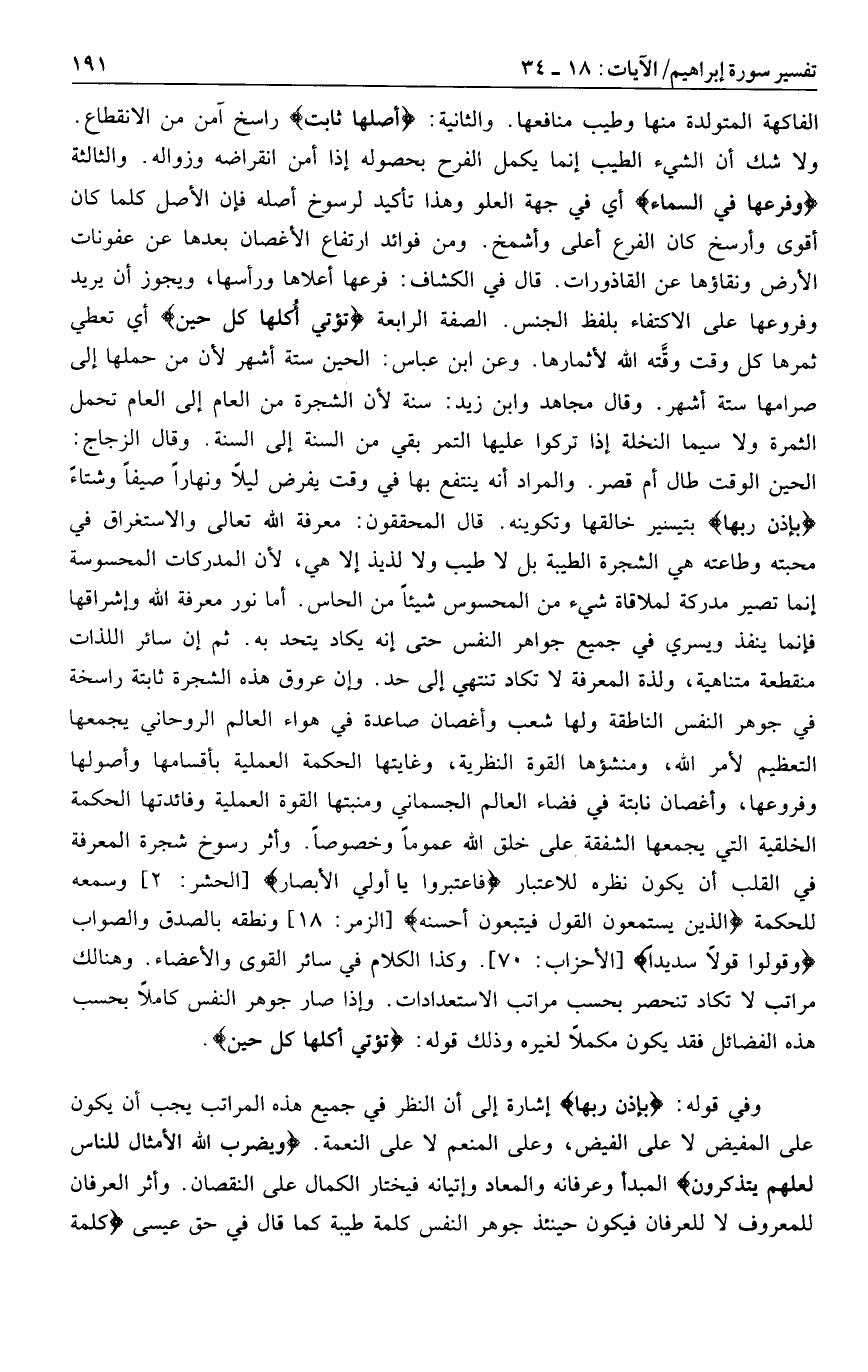 الحين الوقت طال أم قصر. والمراد أنه ينتفع بها في وقت يفرض ليلا ونهارا صيفا وشتاء بِإِذْنِ رَبِّها بتيسير خالقها وتكوينه. قال المحققون: معرفة الله تعالى والاستغراق في محبته وطاعته هي الشجرة الطيبة بل لا طيب ولا لذيذ إلا هي، لأن المدركات المحسوسة إنما تصير مدركة لملاقاة شيء من المحسوس شيئا من الحاس. أما نور معرفة الله وإشراقها فإنما ينفذ ويسري في جميع جواهر النفس حتى إنه يكاد يتحد به. ثم إن سائر اللذات منقطعة متناهية، ولذة المعرفة لا تكاد تنتهي إلى حد. وإن عروق هذه الشجرة ثابتة راسخة في جوهر النفس الناطقة ولها شعب وأغصان صاعدة في هواء العالم الروحاني يجمعها التعظيم لأمر الله، ومنشؤها القوة النظرية، وغايتها الحكمة العملية بأقسامها وأصولها وفروعها، وأغصان نابتة في فضاء العالم الجسماني ومنبتها القوة العملية وفائدتها الحكمة الخلقية التي يجمعها الشفقة على خلق الله عموما وخصوصا. وأثر رسوخ شجرة المعرفة في القلب أن يكون نظره للاعتبار فَاعْتَبِرُوا يا أُولِي الْأَبْصارِ [الحشر: 2] وسمعه للحكمة الَّذِينَ يَسْتَمِعُونَ الْقَوْلَ فَيَتَّبِعُونَ أَحْسَنَهُ [الزمر: 18] ونطقه بالصدق والصواب وَقُولُوا قَوْلًا سَدِيداً [الأحزاب: 70] . وكذا الكلام في سائر القوى والأعضاء. وهنالك مراتب لا تكاد تنحصر بحسب مراتب الاستعدادات. وإذا صار جوهر النفس كاملا بحسب هذه الفضائل فقد يكون مكملا لغيره وذلك قوله: تُؤْتِي أُكُلَها كُلَّ حِينٍ.