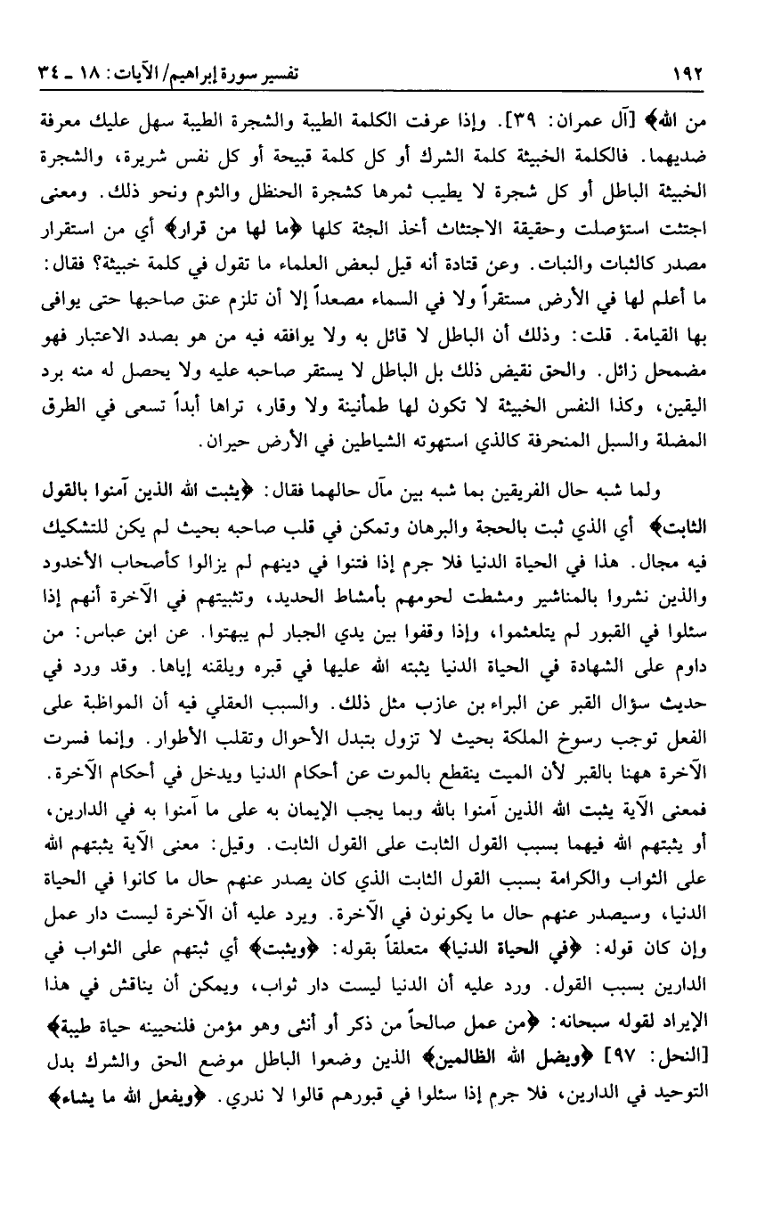 فمعنى الآية يثبت الله الذين آمنوا بالله وبما يجب الإيمان به على ما آمنوا به في الدارين، أو يثبتهم الله فيهما بسبب القول الثابت على القول الثابت. وقيل: معنى الآية يثبتهم الله على الثواب والكرامة بسبب القول الثابت الذي كان يصدر عنهم حال ما كانوا في الحياة الدنيا، وسيصدر عنهم حال ما يكونون في الآخرة. ويرد عليه أن الآخرة ليست دار عمل وإن كان قوله: فِي الْحَياةِ الدُّنْيا متعلقا بقوله: يُثَبِّتُ أي ثبتهم على الثواب في الدارين بسبب القول. ورد عليه أن الدنيا ليست دار ثواب، ويمكن أن يناقش في هذا الإيراد لقوله سبحانه: مَنْ عَمِلَ صالِحاً مِنْ ذَكَرٍ أَوْ أُنْثى وَهُوَ مُؤْمِنٌ فَلَنُحْيِيَنَّهُ حَياةً طَيِّبَةً [النحل: 97] وَيُضِلُّ اللَّهُ الظَّالِمِينَ الذين وضعوا الباطل موضع الحق والشرك بدل التوحيد في الدارين، فلا جرم إذا سئلوا في قبورهم قالوا لا ندري. وَيَفْعَلُ اللَّهُ ما يَشاءُ
