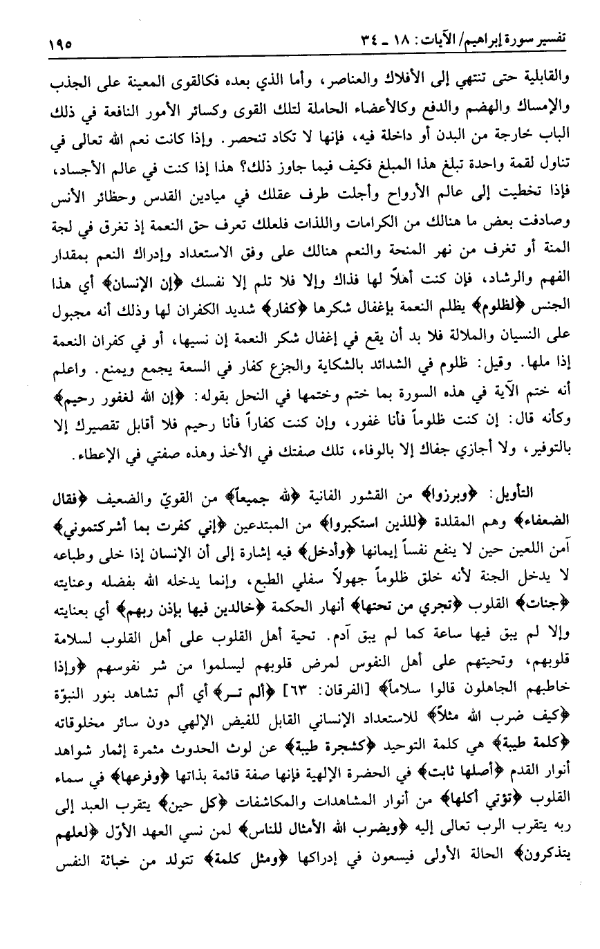 وَبَرَزُوا من القشور الفانية لِلَّهِ جَمِيعاً من القويّ والضعيف فَقالَ الضُّعَفاءُ وهم المقلدة لِلَّذِينَ اسْتَكْبَرُوا من المبتدعين إني كفرت بما أشركتموني آمن اللعين حين لا ينفع نفسا إيمانها وَأُدْخِلَ فيه إشارة إلى أن الإنسان إذا خلى وطباعه لا يدخل الجنة لأنه خلق ظلوما جهولا سفلي الطبع، وإنما يدخله الله بفضله وعنايته جَنَّاتٍ القلوب تَجْرِي مِنْ تَحْتِهَا أنهار الحكمة خالِدِينَ فِيها بِإِذْنِ رَبِّهِمْ أي بعنايته وإلا لم يبق فيها ساعة كما لم يبق آدم. تحية أهل القلوب على أهل القلوب لسلامة قلوبهم، وتحيتهم على أهل النفوس لمرض قلوبهم ليسلموا من شر نفوسهم وَإِذا خاطَبَهُمُ الْجاهِلُونَ قالُوا سَلاماً [الفرقان: 63] أَلَمْ تَرَ أي ألم تشاهد بنور النبوّة كَيْفَ ضَرَبَ اللَّهُ مَثَلًا للاستعداد الإنساني القابل للفيض الإلهي دون سائر مخلوقاته كَلِمَةً طَيِّبَةً هي كلمة التوحيد كَشَجَرَةٍ طَيِّبَةٍ عن لوث الحدوث مثمرة إثمار شواهد أنوار القدم أَصْلُها ثابِتٌ في الحضرة الإلهية فإنها صفة قائمة بذاتها وَفَرْعُها في سماء القلوب تُؤْتِي أُكُلَها من أنوار المشاهدات والمكاشفات كُلَّ حِينٍ يتقرب العبد إلى ربه يتقرب الرب تعالى إليه وَيَضْرِبُ اللَّهُ الْأَمْثالَ لِلنَّاسِ لمن نسي العهد الأوّل لَعَلَّهُمْ يَتَذَكَّرُونَ الحالة الأولى فيسعون في إدراكها وَمَثَلُ كَلِمَةٍ تتولد من خباثة النفس