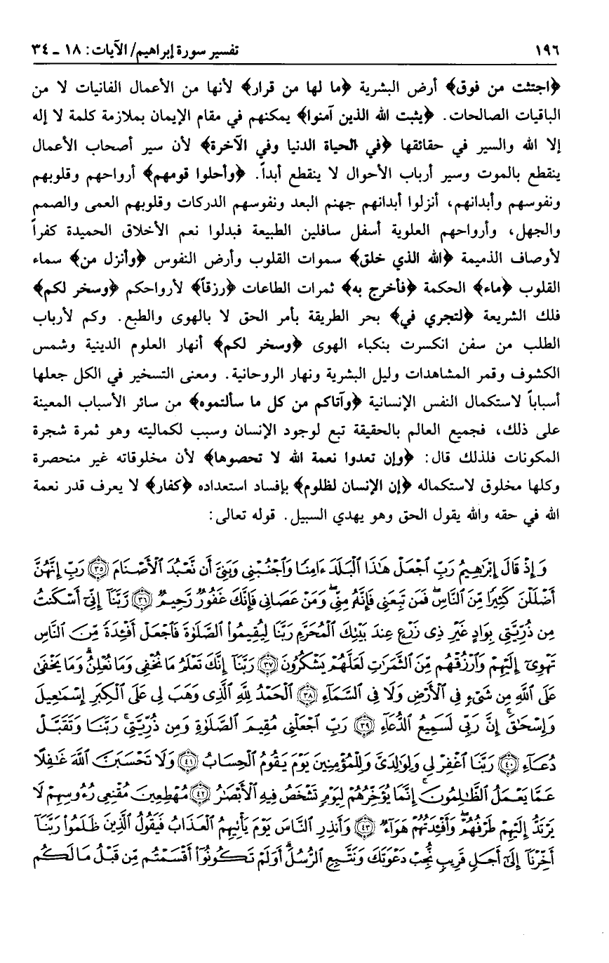 اجْتُثَّتْ مِنْ فَوْقِ أرض البشرية ما لَها مِنْ قَرارٍ لأنها من الأعمال الفانيات لا من الباقيات الصالحات. يُثَبِّتُ اللَّهُ الَّذِينَ آمَنُوا يمكنهم في مقام الإيمان بملازمة كلمة لا إله إلا الله والسير في حقائقها فِي الْحَياةِ الدُّنْيا وَفِي الْآخِرَةِ لأن سير أصحاب الأعمال ينقطع بالموت وسير أرباب الأحوال لا ينقطع أبدا. وَأَحَلُّوا قَوْمَهُمْ أرواحهم وقلوبهم ونفوسهم وأبدانهم، أنزلوا أبدانهم جهنم البعد ونفوسهم الدركات وقلوبهم العمى والصمم والجهل، وأرواحهم العلوية أسفل سافلين الطبيعة فبدلوا نعم الأخلاق الحميدة كفرا لأوصاف الذميمة اللَّهُ الَّذِي خَلَقَ سموات القلوب وأرض النفوس وَأَنْزَلَ مِنَ سماء القلوب ماءً الحكمة فَأَخْرَجَ بِهِ ثمرات الطاعات رِزْقاً لأرواحكم وَسَخَّرَ لَكُمُ فلك الشريعة لِتَجْرِيَ فِي بحر الطريقة بأمر الحق لا بالهوى والطبع. وكم لأرباب الطلب من سفن انكسرت بنكباء الهوى وَسَخَّرَ لَكُمُ أنهار العلوم الدينية وشمس الكشوف وقمر المشاهدات وليل البشرية ونهار الروحانية. ومعنى التسخير في الكل جعلها أسبابا لاستكمال النفس الإنسانية وَآتاكُمْ مِنْ كُلِّ ما سَأَلْتُمُوهُ من سائر الأسباب المعينة على ذلك، فجميع العالم بالحقيقة تبع لوجود الإنسان وسبب لكماليته وهو ثمرة شجرة المكونات فلذلك قال: وَإِنْ تَعُدُّوا نِعْمَةَ اللَّهِ لا تُحْصُوها لأن مخلوقاته غير منحصرة وكلها مخلوق لاستكماله إِنَّ الْإِنْسانَ لَظَلُومٌ بإفساد استعداده كَفَّارٌ لا يعرف قدر نعمة الله في حقه والله يقول الحق وهو يهدي السبيل. قوله تعالى: