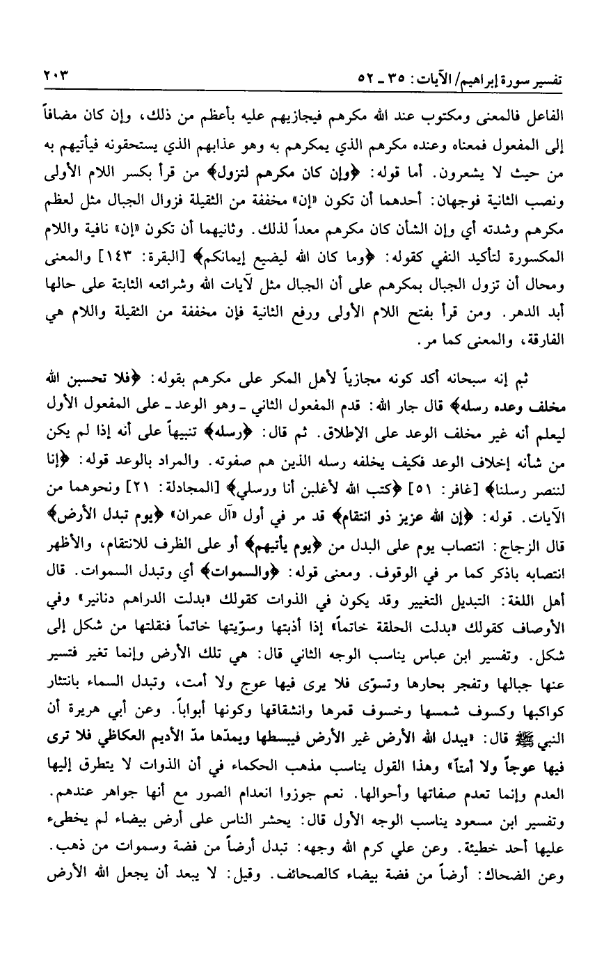 ثم إنه سبحانه أكد كونه مجازيا لأهل المكر على مكرهم بقوله: فَلا تَحْسَبَنَّ اللَّهَ مُخْلِفَ وَعْدِهِ رُسُلَهُ قال جار الله: قدم المفعول الثاني- وهو الوعد- على المفعول الأول ليعلم أنه غير مخلف الوعد على الإطلاق. ثم قال: رُسُلَهُ تنبيها على أنه إذا لم يكن من شأنه إخلاف الوعد فكيف يخلفه رسله الذين هم صفوته. والمراد بالوعد قوله: إِنَّا لَنَنْصُرُ رُسُلَنا [غافر: 51] كَتَبَ اللَّهُ لَأَغْلِبَنَّ أَنَا وَرُسُلِي [المجادلة: 21] ونحوهما من الآيات. قوله: إِنَّ اللَّهَ عَزِيزٌ ذُو انتِقامٍ قد مر في أول «آل عمران» يَوْمَ تُبَدَّلُ الْأَرْضُ قال الزجاج: انتصاب يوم على البدل من يَوْمَ يَأْتِيهِمُ أو على الظرف للانتقام، والأظهر انتصابه باذكر كما مر في الوقوف. ومعنى قوله: وَالسَّماواتُ أي وتبدل السموات. قال أهل اللغة: التبديل التغيير وقد يكون في الذوات كقولك «بدلت الدراهم دنانير» وفي الأوصاف كقولك «بدلت الحلقة خاتما» إذا أذبتها وسوّيتها خاتما فنقلتها من شكل إلى شكل. وتفسير ابن عباس يناسب الوجه الثاني قال: هي تلك الأرض وإنما تغير فتسير عنها جبالها وتفجر بحارها وتسوّى فلا يرى فيها عوج ولا أمت، وتبدل السماء بانتثار كواكبها وكسوف شمسها وخسوف قمرها وانشقاقها وكونها أبوابا.