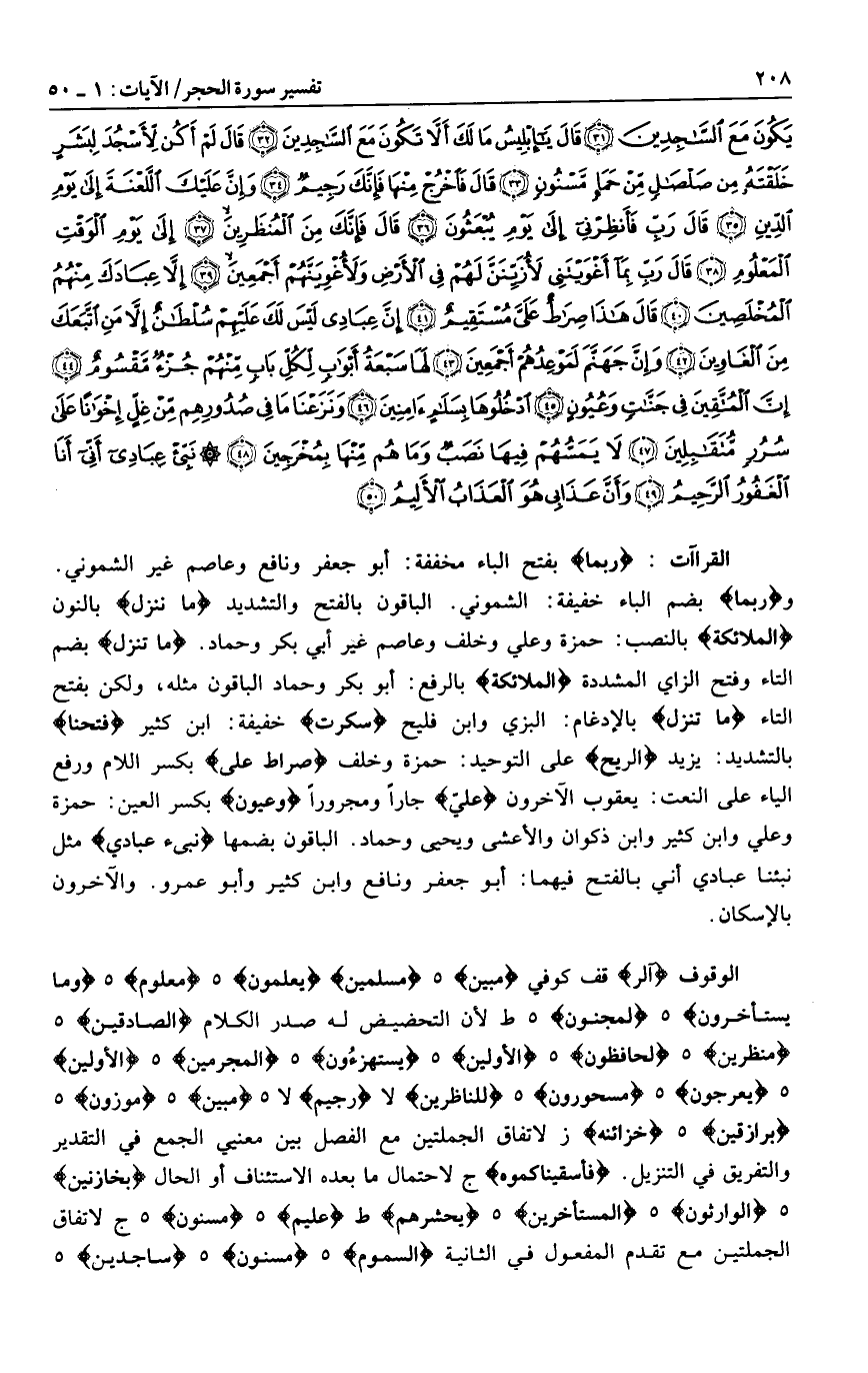 الر قف كوفي مُبِينٍ هـ مُسْلِمِينَ يَعْلَمُونَ هـ مَعْلُومٌ هـ وَما يَسْتَأْخِرُونَ هـ لَمَجْنُونٌ هـ ط لأن التحضيض له صدر الكلام الصَّادِقِينَ هـ مُنْظَرِينَ هـ لَحافِظُونَ هـ الْأَوَّلِينَ هـ يَسْتَهْزِؤُنَ هـ الْمُجْرِمِينَ هـ الْأَوَّلِينَ هـ يَعْرُجُونَ هـ مَسْحُورُونَ هـ لِلنَّاظِرِينَ لا رَجِيمٍ لا هـ مُبِينٌ هـ مَوْزُونٍ هـ بِرازِقِينَ هـ خَزائِنُهُ ز لاتفاق الجملتين مع الفصل بين معنيي الجمع في التقدير والتفريق في التنزيل. فَأَسْقَيْناكُمُوهُ ج لاحتمال ما بعده الاستئناف أو الحال بِخازِنِينَ هـ الْوارِثُونَ هـ الْمُسْتَأْخِرِينَ هـ يَحْشُرُهُمْ ط عَلِيمٌ هـ مَسْنُونٍ هـ ج لاتفاق الجملتين مع تقدم المفعول في الثانية السَّمُومِ هـ مَسْنُونٍ هـ ساجِدِينَ هـ