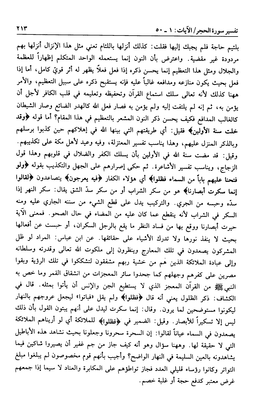 وقيل: قد مضت سنة الله في الأولين بأن يسلك الكفر والضلال في قلوبهم وهذا قول الزجاج، ويناسب تفسير الأشاعرة. ثم حكى إصرارهم على الجهل والتكذيب بقوله وَلَوْ فَتَحْنا عَلَيْهِمْ باباً مِنَ السَّماءِ فَظَلُّوا أي هؤلاء الكفار فِيهِ يَعْرُجُونَ يتصاعدون لَقالُوا إِنَّما سُكِّرَتْ أَبْصارُنا هو من سكر الشراب أو من سكر سدّ الشق يقال: سكر النهر إذا سدّه وحبسه من الجري. والتركيب يدل على قطع الشيء من سننه الجاري عليه ومنه السكر في الشراب لأنه ينقطع عما كان عليه من المضاء في حال الصحو. فمعنى الآية حيرت أبصارنا ووقع بها من فساد النظر ما يقع بالرجل السكران، أو حبست عن أفعالها بحيث لا ينفذ نورها ولا تدرك الأشياء على حقائقها. عن ابن عباس: المراد لو ظل المشركون يصعدون في تلك المعارج وينظرون إلى ملكوت الله تعالى وقدرته وسلطانه وإلى عبادة الملائكة الذين هم من خشية ربهم مشفقون لتشككوا في تلك الرؤية وبقوا مصرين على كفرهم وجهلهم كما جحدوا سائر المعجزات من انشقاق القمر وما خص به النبي صلى الله عليه وسلم من القرآن المعجز الذي لا يستطيع الجن والإنس أن يأتوا بمثله. قال في الكشاف: ذكر الظلول يعني أنه قال فَظَلُّوا ولم يقل «فباتوا» ليجعل عروجهم بالنهار ليكونوا مستوضحين لما يرون. وقال: إنما سكرت ليدل على أنهم يبتون القول بأن ذلك ليس إلا تسكيرا للأبصار. وقيل: الضمير في فَظَلُّوا للملائكة أي لو أريناهم الملائكة يصعدون في السماء عيانا لقالوا: إن السحرة سحرونا وجعلونا بحيث نشاهد هذه الأباطيل التي لا حقيقة لها. وهاهنا سؤال وهو أنه كيف جاز من جم غفير أن يصيروا شاكين فيما يشاهدونه بالعين السليمة في النهار الواضح؟ وأجيب بأنهم قوم مخصوصون لم يبلغوا مبلغ التواتر وكانوا رؤساء قليلي العدد فجاز تواطؤهم على المكابرة والعناد لا سيما إذا جمعهم غرض معتبر كدفع حجة أو غلبة خصم.
