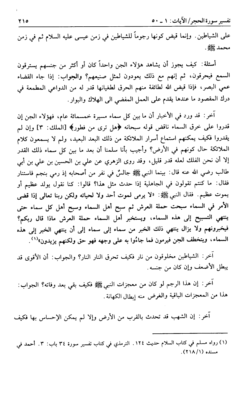 أسئلة: كيف يجوز أن يشاهد هؤلاء الجن واحدا كان أو أكثر من جنسهم يسترقون السمع فيحرقون، ثم إنهم مع ذلك يعودون لمثل صنيعهم؟ والجواب: إذا جاء القضاء عمي البصر، فإذا قيض الله لطائفة منهم الحرق لطغيانها قدر له من الدواعي المطمعة في درك المقصود ما عندها يقدم على العمل المفضي الى الهلاك والبوار.