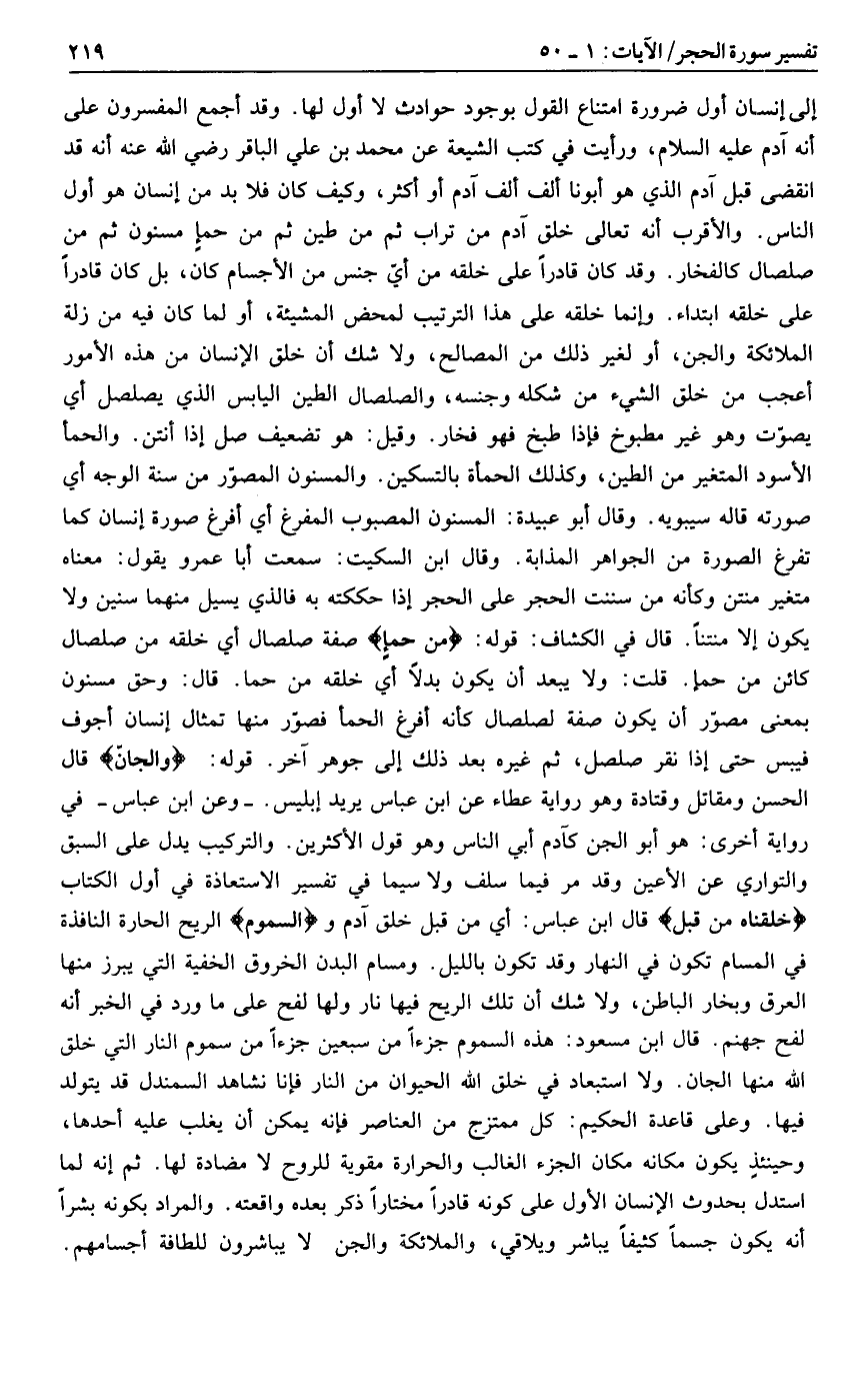 إلى إنسان أول ضرورة امتناع القول بوجود حوادث لا أول لها. وقد أجمع المفسرون على أنه آدم عليه السلام، ورأيت في كتب الشيعة عن محمد بن علي الباقر رضي الله عنه أنه قد انقضى قبل آدم الذي هو أبونا ألف ألف آدم أو أكثر، وكيف كان فلا بد من إنسان هو أول الناس. والأقرب أنه تعالى خلق آدم من تراب ثم من طين ثم من حمإ مسنون ثم من صلصال كالفخار. وقد كان قادرا على خلقه من أيّ جنس من الأجسام كان، بل كان قادرا على خلقه ابتداء. وإنما خلقه على هذا الترتيب لمحض المشيئة، أو لما كان فيه من زلة الملائكة والجن، أو لغير ذلك من المصالح، ولا شك أن خلق الإنسان من هذه الأمور أعجب من خلق الشيء من شكله وجنسه، والصلصال الطين اليابس الذي يصلصل أي يصوّت وهو غير مطبوخ فإذا طبخ فهو فخار. وقيل: هو تضعيف صل إذا أنتن. والحمأ الأسود المتغير من الطين، وكذلك الحمأة بالتسكين. والمسنون المصوّر من سنة الوجه أي صورته قاله سيبويه. وقال أبو عبيدة: المسنون المصبوب المفرغ أي أفرغ صورة إنسان كما تفرغ الصورة من الجواهر المذابة. وقال ابن السكيت: سمعت أبا عمرو يقول: معناه متغير منتن وكأنه من سننت الحجر على الحجر إذا حككته به فالذي يسيل منهما سنين ولا يكون إلا منتنا. قال في الكشاف: قوله: مِنْ حَمَإٍ صفة صلصال أي خلقه من صلصال كائن من حمإ. قلت: ولا يعبد أن يكون بدلا أي خلقه من حما. قال: وحق مسنون بمعنى مصوّر أن يكون صفة لصلصال كأنه أفرغ الحمأ فصوّر منها تمثال إنسان أجوف فيبس حتى إذا نقر صلصل، ثم غيره بعد ذلك إلى جوهر آخر. قوله: وَالْجَانَّ قال الحسن ومقاتل وقتادة وهو رواية عطاء عن ابن عباس يريد إبليس. - وعن ابن عباس- في رواية أخرى: هو أبو الجن كآدم أبي الناس وهو قول الأكثرين. والتركيب يدل على السبق والتواري عن الأعين وقد مر فيما سلف ولا سيما في تفسير الاستعاذة في أول الكتاب خَلَقْناهُ مِنْ قَبْلُ قال ابن عباس: أي من قبل خلق آدم والسَّمُومِ الريح الحارة النافذة في المسام تكون في النهار وقد تكون بالليل. ومسام البدن الخروق الخفية التي يبرز منها العرق وبخار الباطن، ولا شك أن تلك الريح فيها نار ولها لفح على ما ورد في الخبر أنه لفح جهنم. قال ابن مسعود: هذه السموم جزءا من سبعين جزءا من سموم النار التي خلق الله منها الجان. ولا استبعاد في خلق الله الحيوان من النار فإنا نشاهد السمندل قد يتولد فيها. وعلى قاعدة الحكيم: كل ممتزج من العناصر فإنه يمكن أن يغلب عليه أحدها، وحينئذ يكون مكانه مكان الجزء الغالب والحرارة مقوية للروح لا مضادة لها. ثم إنه لما استدل بحدوث الإنسان الأول على كونه قادرا مختارا ذكر بعده واقعته. والمراد بكونه بشرا أنه يكون جسما كثيفا يباشر ويلاقي، والملائكة والجن لا يباشرون للطافة أجسامهم.