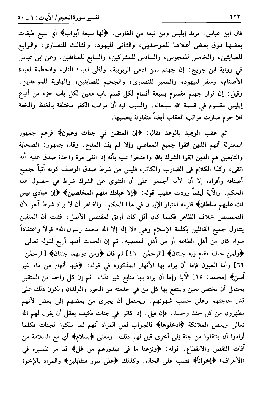 ثم عقب الوعيد بالوعد فقال: إِنَّ الْمُتَّقِينَ فِي جَنَّاتٍ وَعُيُونٍ فزعم جمهور المعتزلة أنهم الذين اتقوا جميع المعاصي وإلا لم يفد المدح. وقال جمهور: الصحابة والتابعين هم الذين اتقوا الشرك بالله واحتجوا عليه بأنه إذا اتقى مرة واحدة صدق عليه أنه اتقى، وكذا الكلام في الضارب والكاتب فليس من شرط صدق الوصف كونه آتيا بجميع أصنافه وأفراده إلا أن الأمة أجمعوا على أن التقوى عن الشرك شرط في حصول هذا الحكم. والآية أيضا وردت عقيب قوله: إِلَّا عِبادَكَ مِنْهُمُ الْمُخْلَصِينَ إِنَّ عِبادِي لَيْسَ لَكَ عَلَيْهِمْ سُلْطانٌ فلزمه اعتبار الإيمان في هذا الحكم. والظاهر أن لا يراد شرط آخر لأن التخصيص خلاف الظاهر فكلما كان أقل كان أوفق لمقتضى الأصل، فثبت أن المتقين يتناول جميع القائلين بكلمة الإسلام وهي «لا إله إلا الله محمد رسول الله» قولا واعتقادا سواء كان من أهل الطاعة أو من أهل المعصية. ثم إن الجنات أقلها أربع لقوله تعالى: