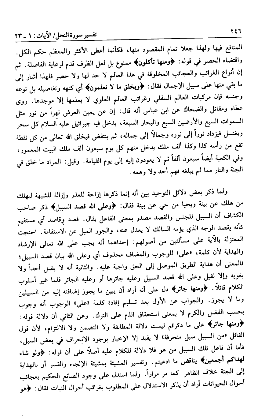 وَمِنْها جائِرٌ على ما ذكرتم ليست دلالة المطابقة ولا التضمن ولا الالتزام، لأن قول القائل «من السبيل سبل منحرفة» لا يفيد إلا الإخبار بوجود الانحراف في بعض السبل، فأما أن فاعل تلك السبيل من هو فلا دلالة للكلام عليه أصلا على أن قوله: وَلَوْ شاءَ لَهَداكُمْ أَجْمَعِينَ يناقض ما ادعيتم. وتفسير المشيئة بمشيئة الإلجاء والقسر أو بالهداية إلى الجنة خلاف الظاهر كما مر مرارا. ولما استدل على وجود الصانع الحكيم بعجائب أحوال الحيوانات أراد أن يذكر الاستدلال على المطلوب بغرائب أحوال النبات فقال: هُوَ