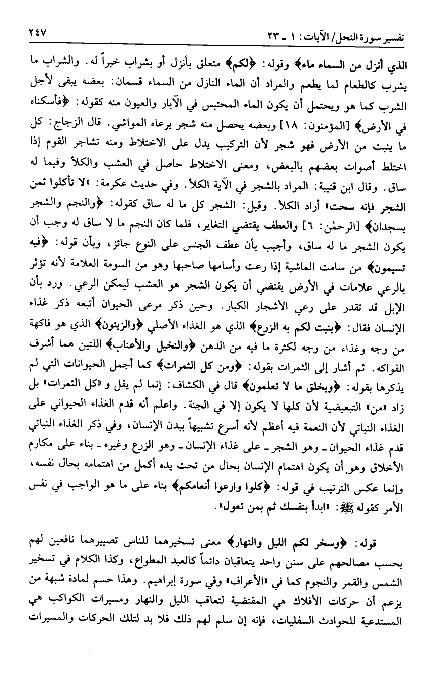 الَّذِي أَنْزَلَ مِنَ السَّماءِ ماءً وقوله: لَكُمْ متعلق بأنزل أو بشراب خبرا له. والشراب ما يشرب كالطعام لما يطعم والمراد أن الماء النازل من السماء قسمان: بعضه يبقى لأجل الشرب كما هو ويحتمل أن يكون الماء المحتبس في الآبار والعيون منه كقوله: فَأَسْكَنَّاهُ فِي الْأَرْضِ [المؤمنون: 18] وبعضه يحصل منه شجر يرعاه المواشي. قال الزجاج: كل ما ينبت من الأرض فهو شجر لأن التركيب يدل على الاختلاط ومنه تشاجر القوم إذا اختلط أصوات بعضهم بالبعض، ومعنى الاختلاط حاصل في العشب والكلأ وفيما له ساق. وقال ابن قتيبة: المراد بالشجر في الآية الكلأ.