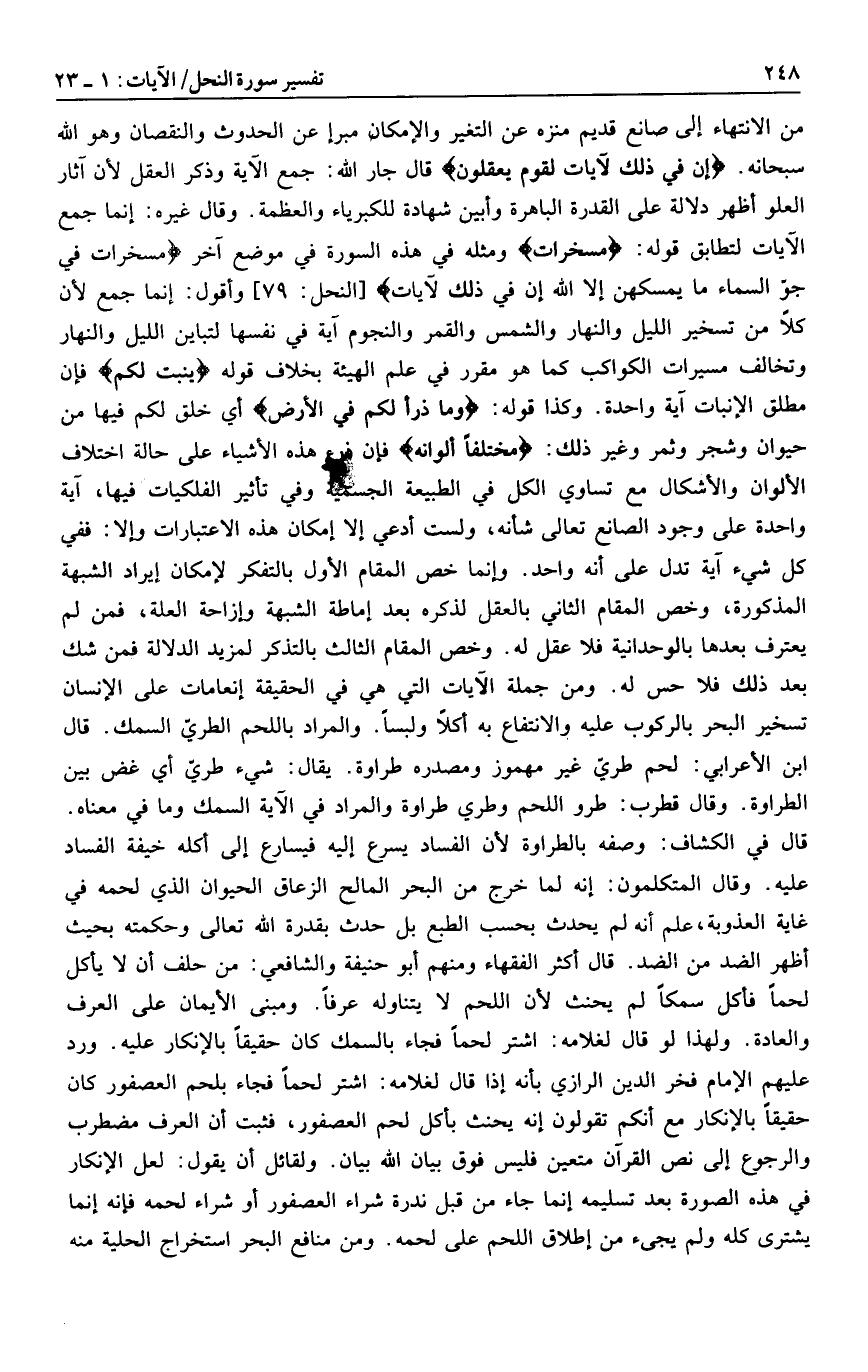 قال في الكشاف: وصفه بالطراوة لأن الفساد يسرع إليه فيسارع إلى أكله خيفة الفساد عليه. وقال المتكلمون: إنه لما خرج من البحر المالح الزعاق الحيوان الذي لحمه في غاية العذوبة، علم أنه لم يحدث بحسب الطبع بل حدث بقدرة الله تعالى وحكمته بحيث أظهر الضد من الضد. قال أكثر الفقهاء ومنهم أبو حنيفة والشافعي: من حلف أن لا يأكل لحما فأكل سمكا لم يحنث لأن اللحم لا يتناوله عرفا. ومبنى الأيمان على العرف والعادة. ولهذا لو قال لغلامه: اشتر لحما فجاء بالسمك كان حقيقا بالإنكار عليه. ورد عليهم الإمام فخر الدين الرازي بأنه إذا قال لغلامه: اشتر لحما فجاء بلحم العصفور كان حقيقا بالإنكار مع أنكم تقولون إنه يحنث بأكل لحم العصفور، فثبت أن العرف مضطرب والرجوع إلى نص القرآن متعين فليس فوق بيان الله بيان. ولقائل أن يقول: لعل الإنكار في هذه الصورة بعد تسليمه إنما جاء من قبل ندرة شراء العصفور أو شراء لحمه فإنه إنما يشترى كله ولم يجىء من إطلاق اللحم على لحمه. ومن منافع البحر استخراج الحلية منه
