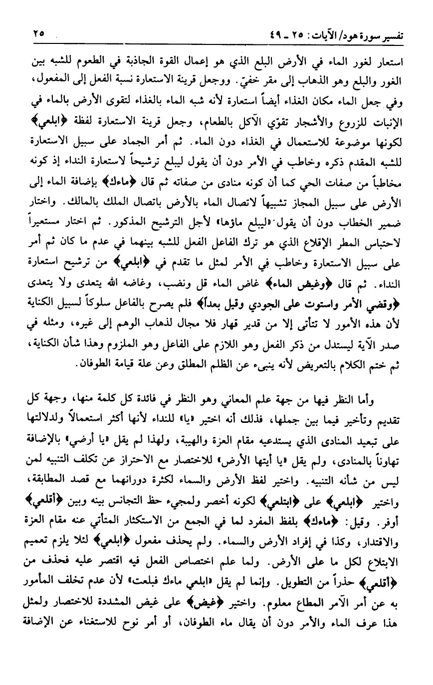 استعار لغور الماء في الأرض البلع الذي هو إعمال القوة الجاذبة في الطعوم للشبه بين الغور والبلع وهو الذهاب إلى مقر خفيّ. وو جعل قرينة الاستعارة نسبة الفعل إلى المفعول، وفي جعل الماء مكان الغذاء أيضا استعارة لأنه شبه الماء بالغذاء لتقوى الأرض بالماء في الإنبات للزروع والأشجار تقوّي الآكل بالطعام، وجعل قرينة الاستعارة لفظة ابْلَعِي لكونها موضوعة للاستعمال في الغذاء دون الماء. ثم أمر الجماد على سبيل الاستعارة للشبه المقدم ذكره وخاطب في الأمر دون أن يقول ليبلع ترشيحا لاستعارة النداء إذ كونه مخاطبا من صفات الحي كما أن كونه منادى من صفاته ثم قال ماءَكِ بإضافة الماء إلى الأرض على سبيل المجاز تشبيها لاتصال الماء بالأرض باتصال الملك بالمالك. واختار ضمير الخطاب دون أن يقول «ليبلع ماؤها» لأجل الترشيح المذكور. ثم اختار مستعيرا لاحتباس المطر الإقلاع الذي هو ترك الفاعل الفعل للشبه بينهما في عدم ما كان ثم أمر على سبيل الاستعارة وخاطب في الأمر لمثل ما تقدم في ابْلَعِي من ترشيح استعارة النداء. ثم قال وَغِيضَ الْماءُ غاض الماء قل ونضب، وغاضه الله يتعدى ولا يتعدى وَقُضِيَ الْأَمْرُ وَاسْتَوَتْ عَلَى الْجُودِيِّ وَقِيلَ بُعْداً فلم يصرح بالفاعل سلوكا لسبيل الكناية لأن هذه الأمور لا تتأتى إلا من قدير قهار فلا مجال لذهاب الوهم إلى غيره، ومثله في صدر الآية ليستدل من ذكر الفعل وهو اللازم على الفاعل وهو الملزوم وهذا شأن الكناية، ثم ختم الكلام بالتعريض لأنه ينبىء عن الظلم المطلق وعن علة قيامة الطوفان.