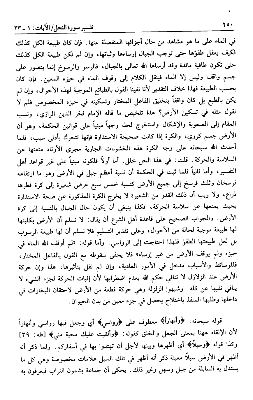 في الماء على ما هو مشاهد من حال أجزائها المنفصلة عنها. فإن كان طبيعة الكل كذلك فكيف يعقل طفوّها حتى توجب الجبال إرساءها وثباتها، وإن لم تكن طبيعة الكل كذلك حتى تكون طافية مائدة وقد أرساها الله تعالى بالجبال، فالرسو والرسوخ إنما يتصور على جسم واقف وليس إلا الماء فينقل الكلام إلى وقوف الماء في حيزه المعين. فإن كان بحسب الطبيعة فهذا خلاف التقدير لأنا نفينا القول بالطبائع الموجبة لهذه الأحوال، وإن لم يكن بالطبع بل كان واقفا بتخليق الفاعل المختار وتسكينه في حيزه المخصوص فلم لا نقول مثله في تسكين الأرض؟ هذا تلخيص ما قاله الإمام فخر الدين الرازي، ونسب المقام إلى الصعوبة والإشكال واستخرج لحله وجها مبنيا على قوانين الحكمة، وهو أن الأرض جسم كروي، والكرة إذا كانت صحيحة الاستدارة فإنها تتحرك بأدنى سبب، فلما أحدث الله سبحانه على وجه الكرة هذه الخشونات الجارية مجرى الأوتاد منعتها عن السلاسة والحركة. قلت: في هذا الحل خلل. أما أولا فلكونه مبنيا على غير قواعد أهل التفسير، وأما ثانيا فلما ثبت في الحكمة أن نسبة أعظم جبل في الأرض وهو ما ارتفاعه فرسخان وثلث فرسخ إلى جميع الأرض كنسبة خمس سبع عرض شعيرة إلى كرة قطرها ذراع، ولا ريب أن ذلك القدر من الشعيرة لا يخرج الكرة المذكورة عن صحة الاستدارة بحيث يمنعها عن سلاسة الحركة، فكذا ينبغي أن يكون حال الجبال بالنسبة إلى كرة الأرض. والجواب الصحيح على قاعدة أهل الشرع أن يقال: لا نسلم أن الأرض بكليتها لها طبيعة موجبة لحالة من الأحوال، وعلى تقدير التسليم فلا نسلم أن لها طبيعة الرسوب بل لعل طبيعتها الطفو فلهذا احتاجت إلى الرواسي. وأما