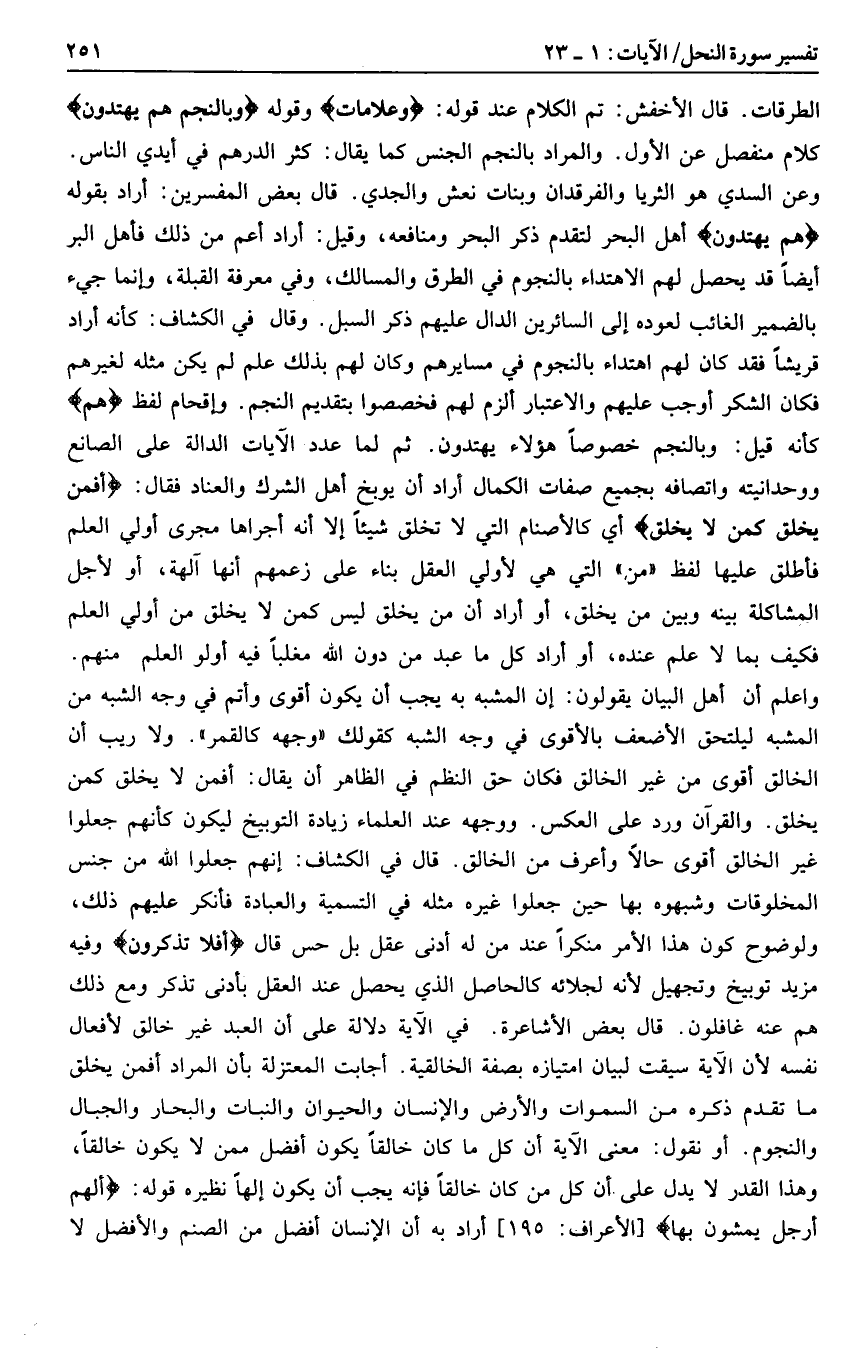 وعن السدي هو الثريا والفرقدان وبنات نعش والجدي. قال بعض المفسرين: أراد بقوله هُمْ يَهْتَدُونَ أهل البحر لتقدم ذكر البحر ومنافعه، وقيل: أراد أعم من ذلك فأهل البر أيضا قد يحصل لهم الاهتداء بالنجوم في الطرق والمسالك، وفي معرفة القبلة، وإنما جيء بالضمير الغائب لعوده إلى السائرين الدال عليهم ذكر السبل. وقال في الكشاف: كأنه أراد قريشا فقد كان لهم اهتداء بالنجوم في مسايرهم وكان لهم بذلك علم لم يكن مثله لغيرهم فكان الشكر أوجب عليهم والاعتبار ألزم لهم فخصصوا بتقديم النجم. وإقحام لفظ هُمْ كأنه قيل: وبالنجم خصوصا هؤلاء يهتدون. ثم لما عدد الآيات الدالة على الصانع ووحدانيته واتصافه بجميع صفات الكمال أراد أن يوبخ أهل الشرك والعناد فقال: أَفَمَنْ يَخْلُقُ كَمَنْ لا يَخْلُقُ أي كالأصنام التي لا تخلق شيئا إلا أنه أجراها مجرى أولي العلم فأطلق عليها لفظ «من» التي هي لأولي العقل بناء على زعمهم أنها آلهة، أو لأجل المشاكلة بينه وبين من يخلق، أو أراد أن من يخلق ليس كمن لا يخلق من أولي العلم فكيف بما لا علم عنده، أو أراد كل ما عبد من دون الله مغلبا فيه أولو العلم منهم.