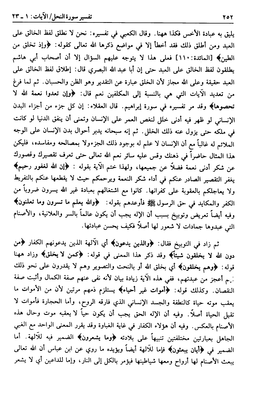 يليق به عبادة الأخس فكذا هاهنا. وقال الكعبي في تفسيره: نحن لا نطلق لفظ الخالق على العبد ومن أطلق ذلك فقد أخطأ إلا في مواضع ذكرها الله تعالى كقوله: وَإِذْ تَخْلُقُ مِنَ الطِّينِ [المائدة: 110] فعلى هذا لا يتوجه عليهم السؤال إلا أن أصحاب أبي هاشم يطلقون لفظ الخالق على العبد حتى إن أبا عبد الله البصري قال: إطلاق لفظ الخالق على العبد حقيقة وعلى الله مجاز لأن الخلق عبارة عن التقدير وهو الظن والحسبان. ثم لما فرغ من تعديد الآيات التي هي بالنسبة إلى المكلفين نعم قال: وَإِنْ تَعُدُّوا نِعْمَةَ اللَّهِ لا تُحْصُوها وقد مر تفسيره في سورة إبراهيم. قال العقلاء: إن كل جزء من أجزاء البدن الإنساني لو ظهر فيه أدنى خلل لنغص العمر على الإنسان وتمنى أن ينفق الدنيا لو كانت في ملكه حتى يزول عنه ذلك الخلل. ثم إنه سبحانه يدبر أحوال بدن الإنسان على الوجه الملائم له غالبا مع أن الإنسان لا علم له بوجود ذلك الجزء ولا بمصالحه ومفاسده، فليكن هذا المثال حاضرا في ذهنك وقس عليه سائر نعم الله تعالى حتى تعرف تقصيرك وقصورك عن شكر أدنى نعمة فضلا عن جميعها، ولهذا ختم الآية بقوله: إِنَّ اللَّهَ لَغَفُورٌ رَحِيمٌ يغفر التقصير الصادر عنكم في أداء شكر النعمة ويرحمكم حيث لا يقطعها عنكم بالتفريط ولا يعاجلكم بالعقوبة على كفرانها. كانوا مع اشتغالهم بعبادة غير الله يسرون ضروبا من الكفر والمكايد في حق الرسول صلى الله عليه وسلم فأوعدهم بقوله: وَاللَّهُ يَعْلَمُ ما تُسِرُّونَ وَما تُعْلِنُونَ وفيه أيضا تعريض وتوبيخ بسبب أن الإله يجب أن يكون عالما بالسر والعلانية، والأصنام التي عبدوها جمادات لا شعور لها أصلا فكيف يحسن عبادتها.