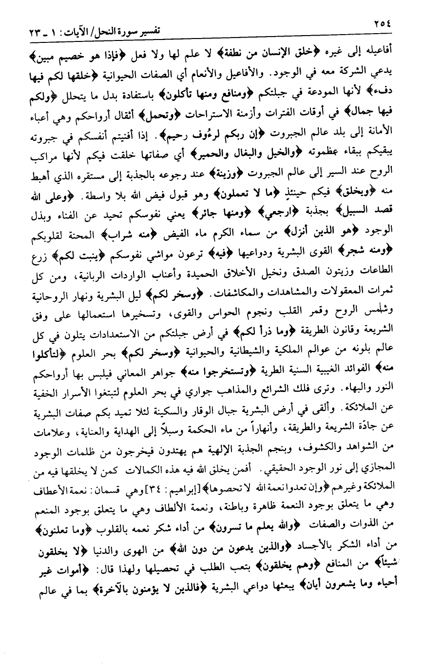 أفاعيله إلى غيره خَلَقَ الْإِنْسانَ مِنْ نُطْفَةٍ لا علم لها ولا فعل فَإِذا هُوَ خَصِيمٌ مُبِينٌ يدعي الشركة معه في الوجود. والأفاعيل والأنعام أي الصفات الحيوانية خَلَقَها لَكُمْ فِيها دِفْءٌ لأنها المودعة في جبلتكم وَمَنافِعُ وَمِنْها تَأْكُلُونَ باستفادة بدل ما يتحلل وَلَكُمْ فِيها جَمالٌ في أوقات الفترات وأزمنة الاستراحات وَتَحْمِلُ أثقال أرواحكم وهي أعباء الأمانة إلى بلد عالم الجبروت إِنَّ رَبَّكُمْ لَرَؤُفٌ رَحِيمٌ. إذا أفنيتم أنفسكم في جبروته يبقيكم ببقاء عظموته وَالْخَيْلَ وَالْبِغالَ وَالْحَمِيرَ أي صفاتها خلقت فيكم لأنها مراكب الروح عند السير إلى عالم الجبروت وَزِينَةً عند رجوعه بالجذبة إلى مستقره الذي أهبط منه وَيَخْلُقُ فيكم حينئذ ما لا تَعْلَمُونَ وهو قبول فيض الله بلا واسطة. وَعَلَى اللَّهِ قَصْدُ السَّبِيلِ بجذبة ارْجِعِي وَمِنْها جائِرٌ يعني نفوسكم تحيد عن الفناء وبذل الوجود هُوَ الَّذِي أَنْزَلَ من سماء الكرم ماء الفيض مِنْهُ شَرابٌ المحنة لقلوبكم وَمِنْهُ شَجَرٌ القوى البشرية ودواعيها فِيهِ ترعون مواشي نفوسكم يُنْبِتُ لَكُمْ زرع الطاعات وزيتون الصدق ونخيل الأخلاق الحميدة وأعناب الواردات الربانية، ومن كل ثمرات المعقولات والمشاهدات والمكاشفات. وَسَخَّرَ لَكُمُ ليل البشرية ونهار الروحانية وشمس الروح وقمر القلب ونجوم الحواس والقوى، وتسخيرها استعمالها على وفق الشريعة وقانون الطريقة وَما ذَرَأَ لَكُمْ في أرض جبلتكم من الاستعدادات يتلون في كل عالم بلونه من عوالم الملكية والشيطانية والحيوانية وسَخَّرَ لكم بحر العلوم لِتَأْكُلُوا مِنْهُ الفوائد الغيبية السنية الطريقة وَتَسْتَخْرِجُوا مِنْهُ جواهر المعاني فيلبس بها أرواحكم النور والبهاء. وترى فلك الشرائع والمذاهب جواري في بحر العلوم لتبتغوا الأسرار الخفية عن الملائكة. وألقى في أرض البشرية جبال الوقار والسكينة لئلا تميد بكم صفات البشرية عن جادّة الشريعة والطريقة، وأنهارا من ماء الحكمة وسبلا إلى الهداية والعناية، وعلامات من الشواهد والكشوف، وبنجم الجذبة الإلهية هم يهتدون فيخرجون من ظلمات الوجود المجازي إلى نور الوجود الحقيقي. أفمن يخلق الله فيه هذه الكمالات كمن لا يخلقها فيه من الملائكة وغيرهم وَإِنْ تَعُدُّوا نِعْمَةَ اللَّهِ لا تُحْصُوها [إبراهيم: 34] وهي قسمان: نعمة الأعطاف وهي ما يتعلق بوجود النعمة ظاهرة وباطنة، ونعمة الألطاف وهي ما يتعلق بوجود المنعم من الذوات والصفات وَاللَّهُ يَعْلَمُ ما تُسِرُّونَ من أداء شكر نعمه بالقلوب وَما تُعْلِنُونَ من أداء الشكر بالأجساد وَالَّذِينَ يَدْعُونَ مِنْ دُونِ اللَّهِ من الهوى والدنيا لا يَخْلُقُونَ شَيْئاً من المنافع وَهُمْ يُخْلَقُونَ بتعب الطلب في تحصيلها ولهذا قال: أَمْواتٌ غَيْرُ أَحْياءٍ وَما يَشْعُرُونَ أَيَّانَ يبعثها دواعي البشرية فَالَّذِينَ لا يُؤْمِنُونَ بِالْآخِرَةِ بما في عالم