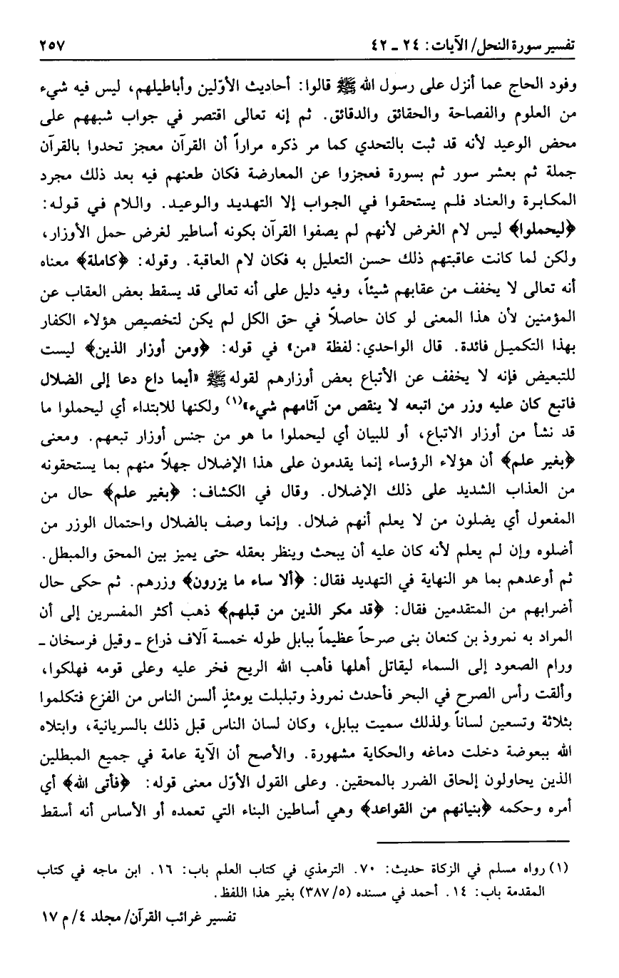 لِيَحْمِلُوا ليس لام الغرض لأنهم لم يصفوا القرآن بكونه أساطير لغرض حمل الأوزار، ولكن لما كانت عاقبتهم ذلك حسن التعليل به فكان لام العاقبة. وقوله: كامِلَةً معناه أنه تعالى لا يخفف من عقابهم شيئا، وفيه دليل على أنه تعالى قد يسقط بعض العقاب عن المؤمنين لأن هذا المعنى لو كان حاصلا في حق الكل لم يكن لتخصيص هؤلاء الكفار بهذا التكميل فائدة. قال الواحدي: لفظة «من» في قوله: وَمِنْ أَوْزارِ الَّذِينَ ليست للتبعيض فإنه لا يخفف عن الأتباع بعض أوزارهم