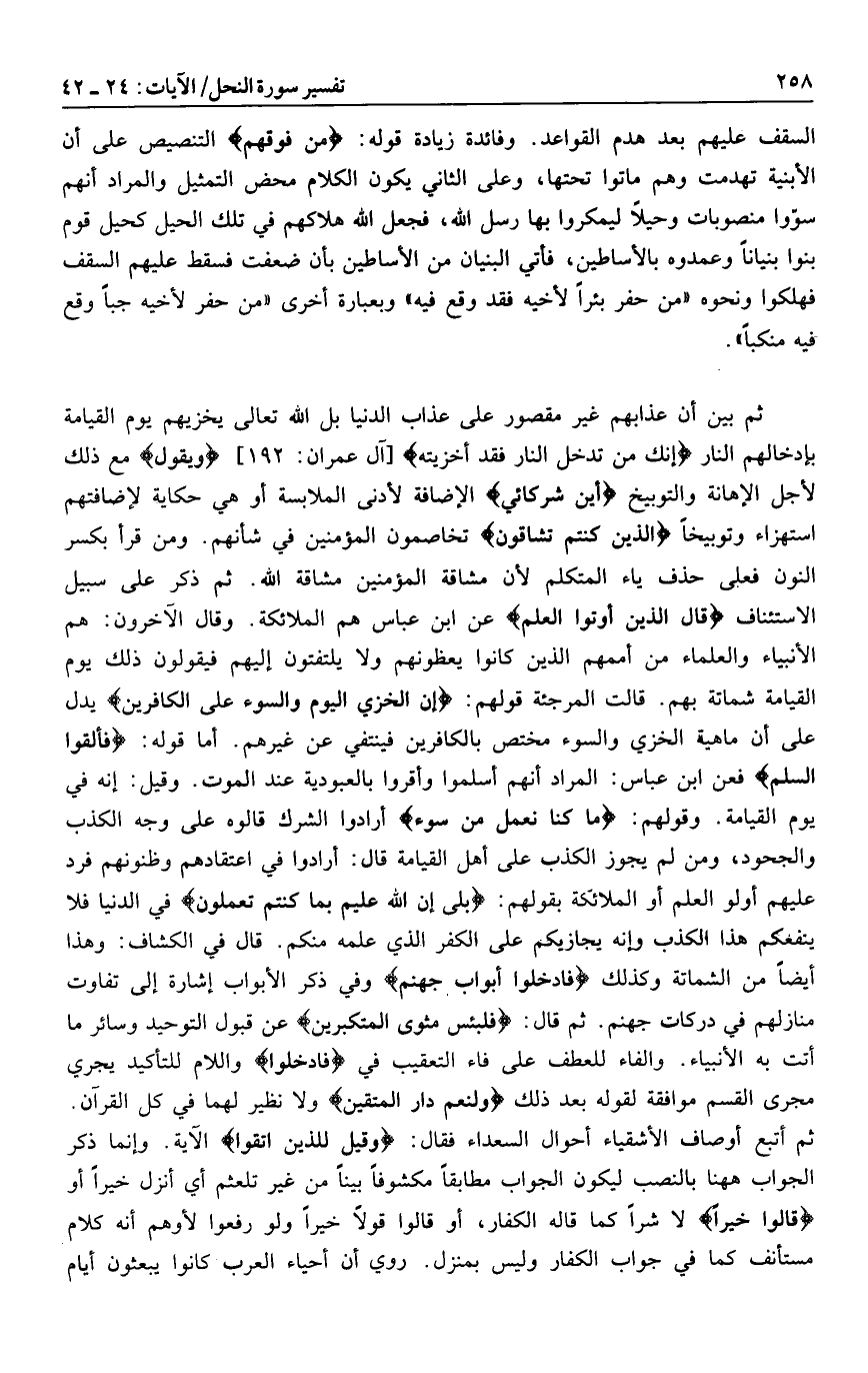 ثم بين أن عذابهم غير مقصور على عذاب الدنيا بل الله تعالى يخزيهم يوم القيامة بإدخالهم النار إِنَّكَ مَنْ تُدْخِلِ النَّارَ فَقَدْ أَخْزَيْتَهُ [آل عمران: 192] وَيَقُولُ مع ذلك لأجل الإهانة والتوبيخ أَيْنَ شُرَكائِيَ الإضافة لأدنى الملابسة أو هي حكاية لإضافتهم استهزاء وتوبيخا الَّذِينَ كُنْتُمْ تُشَاقُّونَ تخاصمون المؤمنين في شأنهم. ومن قرأ بكسر النون فعلى حذف ياء المتكلم لأن مشاقة المؤمنين مشاقة الله. ثم ذكر على سبيل الاستئناف قالَ الَّذِينَ أُوتُوا الْعِلْمَ عن ابن عباس هم الملائكة. وقال الآخرون: هم الأنبياء والعلماء من أممهم الذين كانوا يعظونهم ولا يلتفتون إليهم فيقولون ذلك يوم القيامة شماتة بهم. قالت المرجئة قولهم: إِنَّ الْخِزْيَ الْيَوْمَ وَالسُّوءَ عَلَى الْكافِرِينَ يدل على أن ماهية الخزي والسوء مختص بالكافرين فينتفي عن غيرهم. أما قوله: فَأَلْقَوُا السَّلَمَ فعن ابن عباس: المراد أنهم أسلموا وأقروا بالعبودية عند الموت. وقيل: إنه في يوم القيامة. وقولهم: ما كُنَّا نَعْمَلُ مِنْ سُوءٍ أرادوا الشرك قالوه على وجه الكذب والجحود، ومن لم يجوز الكذب على أهل القيامة قال: أرادوا في اعتقادهم وظنونهم فرد عليهم أولو العلم أو الملائكة بقولهم: بَلى إِنَّ اللَّهَ عَلِيمٌ بِما كُنْتُمْ تَعْمَلُونَ في الدنيا فلا ينفعكم هذا الكذب وإنه يجازيكم على الكفر الذي علمه منكم. قال في الكشاف: وهذا أيضا من الشماتة وكذلك فَادْخُلُوا أَبْوابَ جَهَنَّمَ وفي ذكر الأبواب إشارة إلى تفاوت منازلهم في دركات جهنم. ثم قال: فَلَبِئْسَ مَثْوَى الْمُتَكَبِّرِينَ عن قبول التوحيد وسائر ما أتت به الأنبياء. والفاء للعطف على فاء التعقيب في فَادْخُلُوا واللام للتأكيد يجري مجرى القسم موافقة لقوله بعد ذلك وَلَنِعْمَ دارُ الْمُتَّقِينَ ولا نظير لهما في كل القرآن.