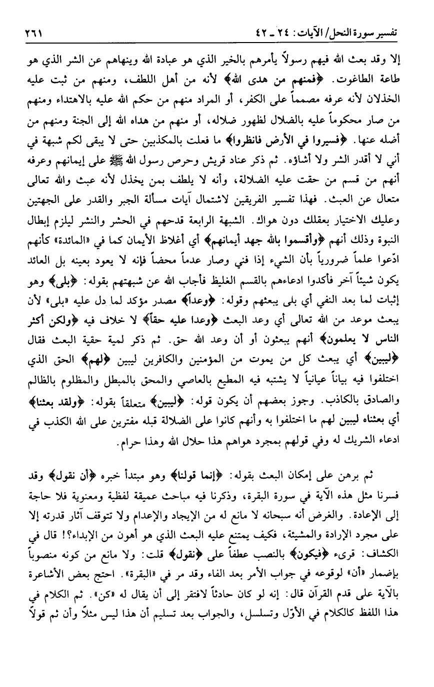 إلا وقد بعث الله فيهم رسولا يأمرهم بالخير الذي هو عبادة الله وينهاهم عن الشر الذي هو طاعة الطاغوت. فَمِنْهُمْ مَنْ هَدَى اللَّهُ لأنه من أهل اللطف، ومنهم من ثبت عليه الخذلان لأنه عرفه مصمما على الكفر، أو المراد منهم من حكم الله عليه بالاهتداء ومنهم من صار محكوما عليه بالضلال لظهور ضلاله، أو منهم من هداه الله إلى الجنة ومنهم من أضله عنها. فَسِيرُوا فِي الْأَرْضِ فَانْظُرُوا ما فعلت بالمكذبين حتى لا يبقى لكم شبهة في أني لا أقدر الشر ولا أشاؤه. ثم ذكر عناد قريش وحرص رسول الله صلى الله عليه وسلم على إيمانهم وعرفه أنهم من قسم من حقت عليه الضلالة، وأنه لا يلطف بمن يخذل لأنه عبث والله تعالى متعال عن العبث. فهذا تفسير الفريقين لاشتمال آيات مسألة الجبر والقدر على الجهتين وعليك الاختيار بعقلك دون هواك. الشبهة الرابعة قدحهم في الحشر والنشر ليلزم إبطال النبوة وذلك أنهم وَأَقْسَمُوا بِاللَّهِ جَهْدَ أَيْمانِهِمْ أي أغلاظ الأيمان كما في «المائدة» كأنهم ادّعوا علما ضروريا بأن الشيء إذا فني وصار عدما محضا فإنه لا يعود بعينه بل العائد يكون شيئا آخر فأكدوا ادعاءهم بالقسم الغليظ فأجاب الله عن شبهتهم بقوله: بَلى وهو إثبات لما بعد النفي أي بلى يبعثهم وقوله: وَعْداً مصدر مؤكد لما دل عليه «بلى» لأن يبعث موعد من الله تعالى أي وعد البعث وَعْداً عَلَيْهِ حَقًّا لا خلاف فيه وَلكِنَّ أَكْثَرَ النَّاسِ لا يَعْلَمُونَ أنهم يبعثون أو أن وعد الله حق. ثم ذكر لمية حقية البعث فقال لِيُبَيِّنَ أي يبعث كل من يموت من المؤمنين والكافرين ليبين لَهُمُ الحق الذي اختلفوا فيه بيانا عيانيا لا يشتبه فيه المطيع بالعاصي والمحق بالمبطل والمظلوم بالظالم والصادق بالكاذب. وجوز بعضهم أن يكون قوله: لِيُبَيِّنَ متعلقا بقوله: وَلَقَدْ بَعَثْنا أي بعثناه ليبين لهم ما اختلفوا به وأنهم كانوا على الضلالة قبله مفترين على الله الكذب في ادعاء الشريك له وفي قولهم بمجرد هواهم هذا حلال الله وهذا حرام.