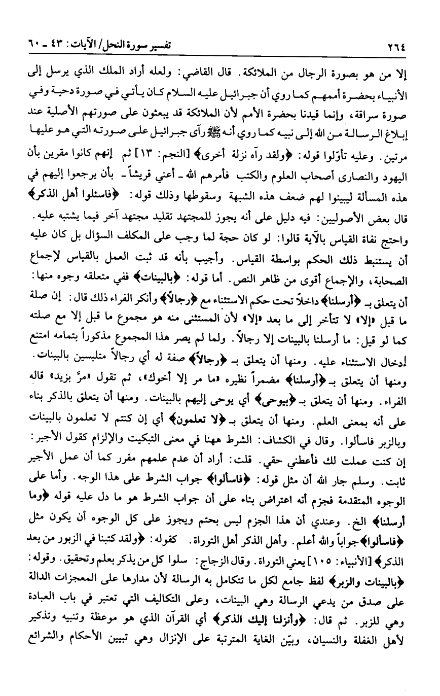 وعليه تأوّلوا قوله: وَلَقَدْ رَآهُ نَزْلَةً أُخْرى [النجم: 13] ثم إنهم كانوا مقرين بأن اليهود والنصارى أصحاب العلوم والكتب فأمرهم الله- أعني قريشا- بأن يرجعوا إليهم في هذه المسألة ليبينوا لهم ضعف هذه الشبهة وسقوطها وذلك قوله: فَسْئَلُوا أَهْلَ الذِّكْرِ قال بعض الأصوليين: فيه دليل على أنه يجوز للمجتهد تقليد مجتهد آخر فيما يشتبه عليه.