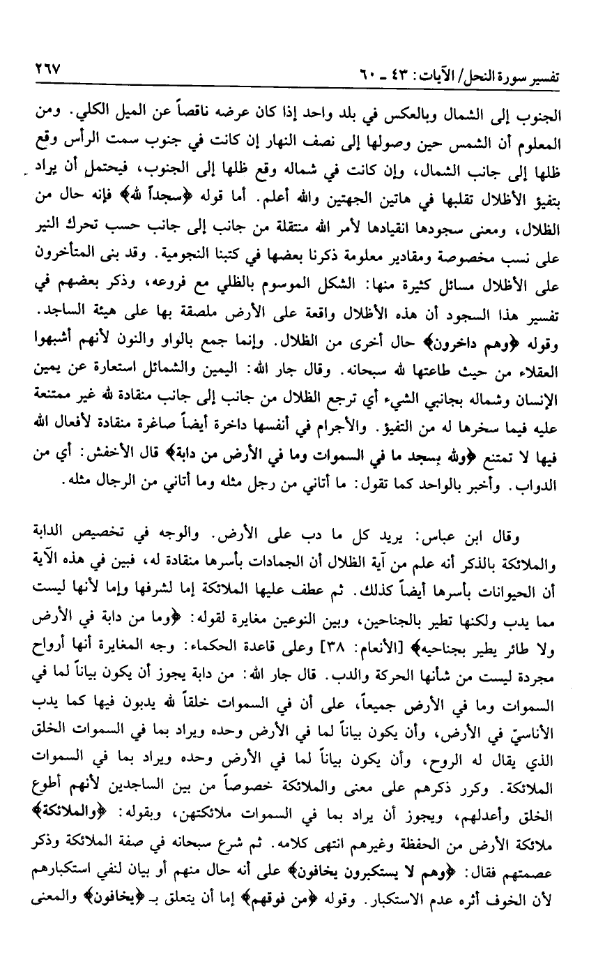 الجنوب إلى الشمال وبالعكس في بلد واحد إذا كان عرضه ناقصا عن الميل الكلي. ومن المعلوم أن الشمس حين وصولها إلى نصف النهار إن كانت في جنوب سمت الرأس وقع ظلها إلى جانب الشمال، وإن كانت في شماله وقع ظلها إلى الجنوب، فيحتمل أن يراد بتفيؤ الأضلال تقلبها في هاتين الجهتين والله أعلم. أما قوله سُجَّداً لِلَّهِ فإنه حال من الظلال، ومعنى سجودها انقيادها لأمر الله منتقلة من جانب إلى جانب حسب تحرك النير على نسب مخصوصة ومقادير معلومة ذكرنا بعضها في كتبنا النجومية. وقد بنى المتأخرون على الأضلال مسائل كثيرة منها: الشكل الموسوم بالظلي مع فروعه، وذكر بعضهم في تفسير هذا السجود أن هذه الأظلال واقعة على الأرض ملصقة بها على هيئة الساجد.