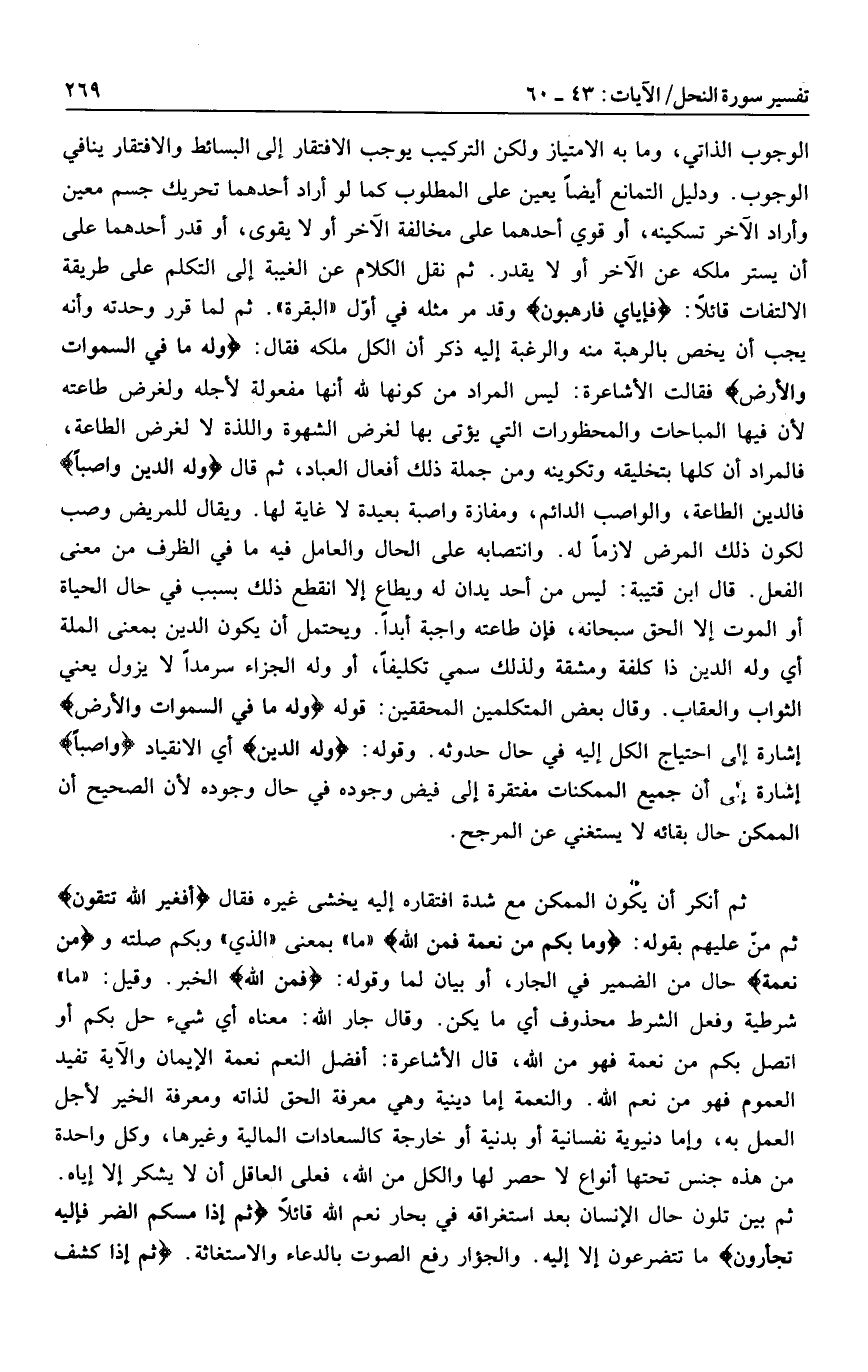 الوجوب الذاتي، وما به الامتياز ولكن التركيب يوجب الافتقار إلى البسائط والافتقار ينافي الوجوب. ودليل التمانع أيضا يعين على المطلوب كما لو أراد أحدهما تحريك جسم معين وأراد الآخر تسكينه، أو قوي أحدهما على مخالفة الآخر أو لا يقوى، أو قدر أحدهما على أن يستر ملكه عن الآخر أو لا يقدر. ثم نقل الكلام عن الغيبة إلى التكلم على طريقة الالتفات قائلا: فَإِيَّايَ فَارْهَبُونِ وقد مر مثله في أوّل «البقرة» . ثم لما قرر وحدته وأنه يجب أن يخص بالرهبة منه والرغبة إليه ذكر أن الكل ملكه فقال: وَلَهُ ما فِي السَّماواتِ وَالْأَرْضِ فقالت الأشاعرة: ليس المراد من كونها لله أنها مفعولة لأجله ولغرض طاعته لأن فيها المباحات والمحظورات التي يؤتى بها لغرض الشهوة واللذة لا لغرض الطاعة، فالمراد أن كلها بتخليقه وتكوينه ومن جملة ذلك أفعال العباد، ثم قال وَلَهُ الدِّينُ واصِباً فالدين الطاعة، والواصب الدائم، ومفازة واصبة بعيدة لا غاية لها. ويقال للمريض وصب لكون ذلك المرض لازما له. وانتصابه على الحال والعامل فيه ما في الظرف من معنى الفعل. قال ابن قتيبة: ليس من أحد يدان له ويطاع إلا انقطع ذلك بسبب في حال الحياة أو الموت إلا الحق سبحانه، فإن طاعته واجبة أبدا. ويحتمل أن يكون الدين بمعنى الملة أي وله الدين ذا كلفة ومشقة ولذلك سمي تكليفا، أو وله الجزاء سرمدا لا يزول يعني الثواب والعقاب. وقال بعض المتكلمين المحققين: قوله وَلَهُ ما فِي السَّماواتِ وَالْأَرْضِ إشارة إلى أن جميع الممكنات مفتقرة إلى فيض وجوده في حال وجوده لأن الصحيح أن الممكن حال بقائه لا يستغني عن المرجح.
