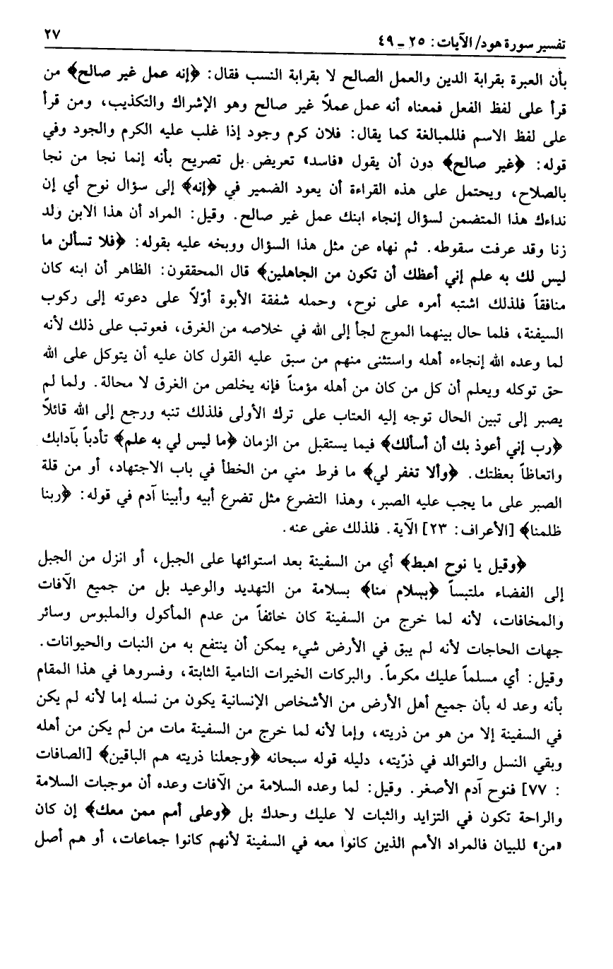بأن العبرة بقرابة الدين والعمل الصالح لا بقرابة النسب فقال: إِنَّهُ عَمَلٌ غَيْرُ صالِحٍ من قرأ على لفظ الفعل فمعناه أنه عمل عملا غير صالح وهو الإشراك والتكذيب، ومن قرأ على لفظ الاسم فللمبالغة كما يقال: فلان كرم وجود إذا غلب عليه الكرم والجود وفي قوله: غَيْرُ صالِحٍ دون أن يقول «فاسد» تعريض بل تصريح بأنه إنما نجا من نجا بالصلاح، ويحتمل على هذه القراءة أن يعود الضمير في إِنَّهُ إلى سؤال نوح أي إن نداءك هذا المتضمن لسؤال إنجاء ابنك عمل غير صالح. وقيل: المراد أن هذا الابن ولد زنا وقد عرفت سقوطه. ثم نهاه عن مثل هذا السؤال ووبخه عليه بقوله: فَلا تَسْئَلْنِ ما لَيْسَ لَكَ بِهِ عِلْمٌ إِنِّي أَعِظُكَ أَنْ تَكُونَ مِنَ الْجاهِلِينَ قال المحققون: الظاهر أن ابنه كان منافقا فلذلك اشتبه أمره على نوح، وحمله شفقة الأبوة أوّلا على دعوته إلى ركوب السفينة، فلما حال بينهما الموج لجأ إلى الله في خلاصه من الغرق، فعوتب على ذلك لأنه لما وعده الله إنجاءه أهله واستثنى منهم من سبق عليه القول كان عليه أن يتوكل على الله حق توكله ويعلم أن كل من كان من أهله مؤمنا فإنه يخلص من الغرق لا محالة. ولما لم يصبر إلى تبين الحال توجه إليه العتاب على ترك الأولى فلذلك تنبه ورجع إلى الله قائلا رَبِّ إِنِّي أَعُوذُ بِكَ أَنْ أَسْئَلَكَ فيما يستقبل من الزمان ما لَيْسَ لِي بِهِ عِلْمٌ تأدبا بآدابك واتعاظا بعظتك. وَإِلَّا تَغْفِرْ لِي ما فرط مني من الخطأ في باب الاجتهاد، أو من قلة الصبر على ما يجب عليه الصبر، وهذا التضرع مثل تضرع أبيه وأبينا آدم في قوله: رَبَّنا ظَلَمْنا [الأعراف: 23] الآية. فلذلك عفى عنه.