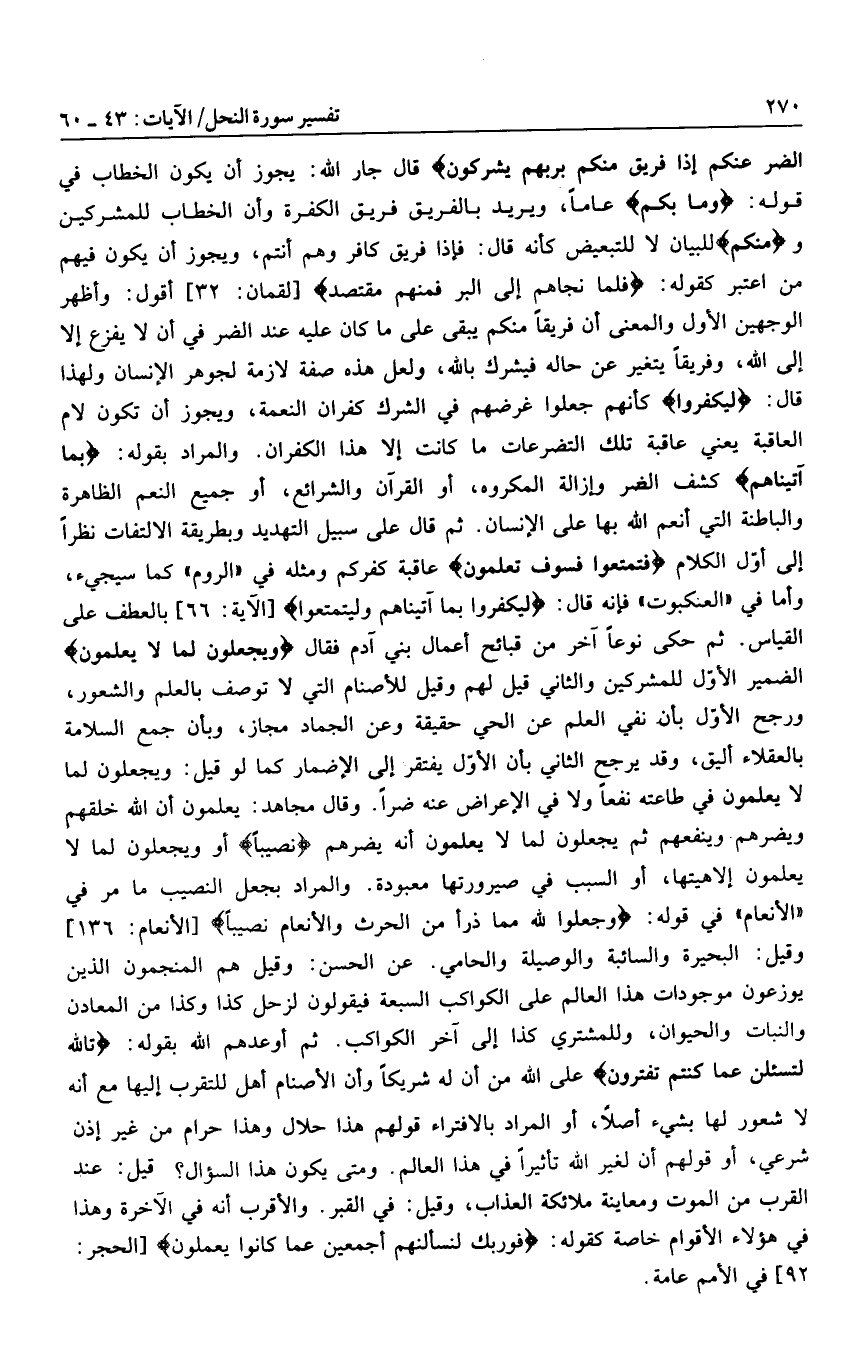 الضُّرَّ عَنْكُمْ إِذا فَرِيقٌ مِنْكُمْ بِرَبِّهِمْ يُشْرِكُونَ قال جار الله: يجوز أن يكون الخطاب في قوله: وَما بِكُمْ عاما، ويريد بالفريق فريق الكفرة وأن الخطاب للمشركين ومِنْكُمْ للبيان لا للتبعيض كأنه قال: فإذا فريق كافر وهم أنتم، ويجوز أن يكون فيهم من اعتبر كقوله: فَلَمَّا نَجَّاهُمْ إِلَى الْبَرِّ فَمِنْهُمْ مُقْتَصِدٌ [لقمان: 32] أقول: وأظهر الوجهين الأول والمعنى أن فريقا منكم يبقى على ما كان عليه عند الضر في أن لا يفزع إلا إلى الله، وفريقا يتغير عن حاله فيشرك بالله، ولعل هذه صفة لازمة لجوهر الإنسان ولهذا قال: لِيَكْفُرُوا كأنهم جعلوا غرضهم في الشرك كفران النعمة، ويجوز أن تكون لام العاقبة يعني عاقبة تلك التضرعات ما كانت إلا هذا الكفران. والمراد بقوله: بِما آتَيْناهُمْ