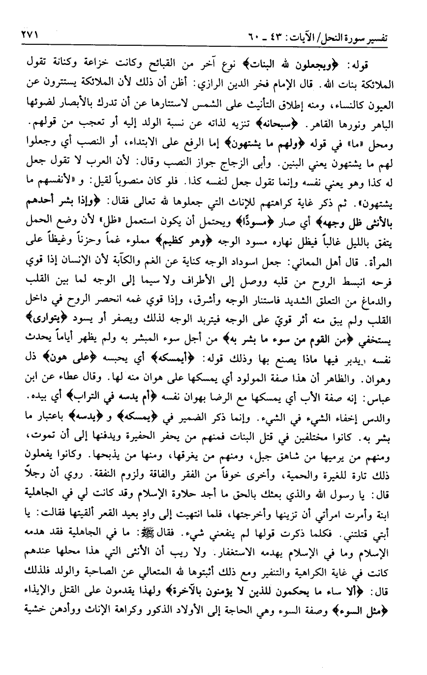 ومحل «ما» في قوله وَلَهُمْ ما يَشْتَهُونَ إما الرفع على الابتداء، أو النصب أي وجعلوا لهم ما يشتهون يعني البنين. وأبي الزجاج جواز النصب وقال: لأن العرب لا تقول جعل له كذا وهو يعني نفسه وإنما تقول جعل لنفسه كذا. فلو كان منصوبا لقيل: و «لأنفسهم ما يشتهون» . ثم ذكر غاية كراهتهم للإناث التي جعلوها لله تعالى فقال: وَإِذا بُشِّرَ أَحَدُهُمْ بِالْأُنْثى ظَلَّ وَجْهُهُ أي صار مُسْوَدًّا ويحتمل أن يكون استعمل «ظل» لأن وضع الحمل يتفق بالليل غالبا فيظل نهاره مسود الوجه وَهُوَ كَظِيمٌ مملوء غما وحزنا وغيظا على المرأة. قال أهل المعاني: جعل اسوداد الوجه كناية عن الغم والكآبة لأن الإنسان إذا قوي فرحه انبسط الروح من قلبه ووصل إلى الأطراف ولا سيما إلى الوجه لما بين القلب والدماغ من التعلق الشديد فاستنار الوجه وأشرق، وإذا قوي غمه انحصر الروح في داخل القلب ولم يبق منه أثر قويّ على الوجه فيتربد الوجه لذلك ويصفر أو يسود يَتَوارى يستخفي مِنَ الْقَوْمِ مِنْ سُوءِ ما بُشِّرَ بِهِ من أجل سوء المبشر به ولم يظهر أياما يحدث نفسه ويدبر فيها ماذا يصنع بها وذلك قوله: أَيُمْسِكُهُ أي يحبسه عَلى هُونٍ ذل وهوان. والظاهر أن هذا صفة المولود أي يمسكها على هوان منه لها. وقال عطاء عن ابن عباس: إنه صفة الأب أي يمسكها مع الرضا بهوان نفسه أَمْ يَدُسُّهُ فِي التُّرابِ أي بيده.